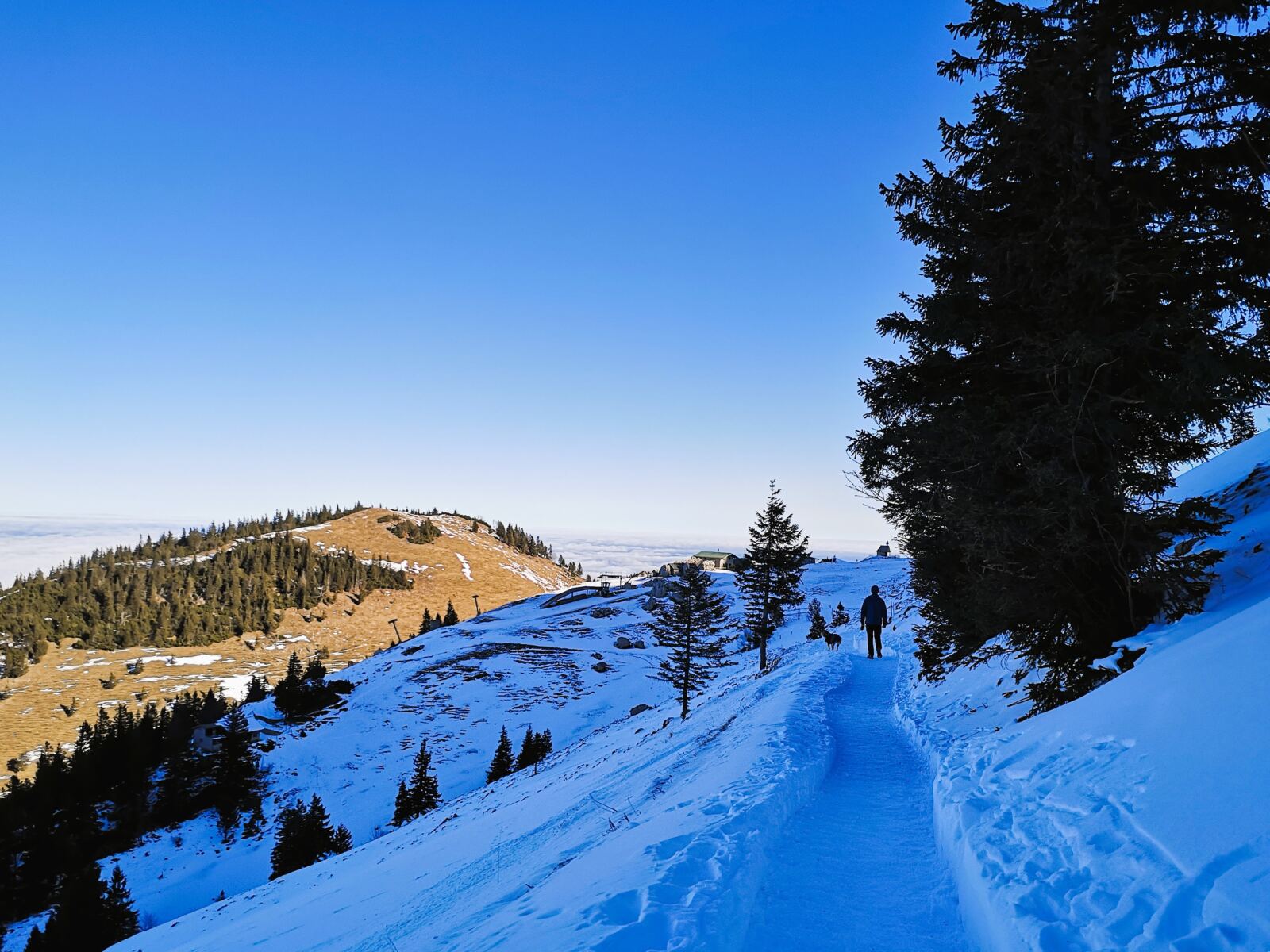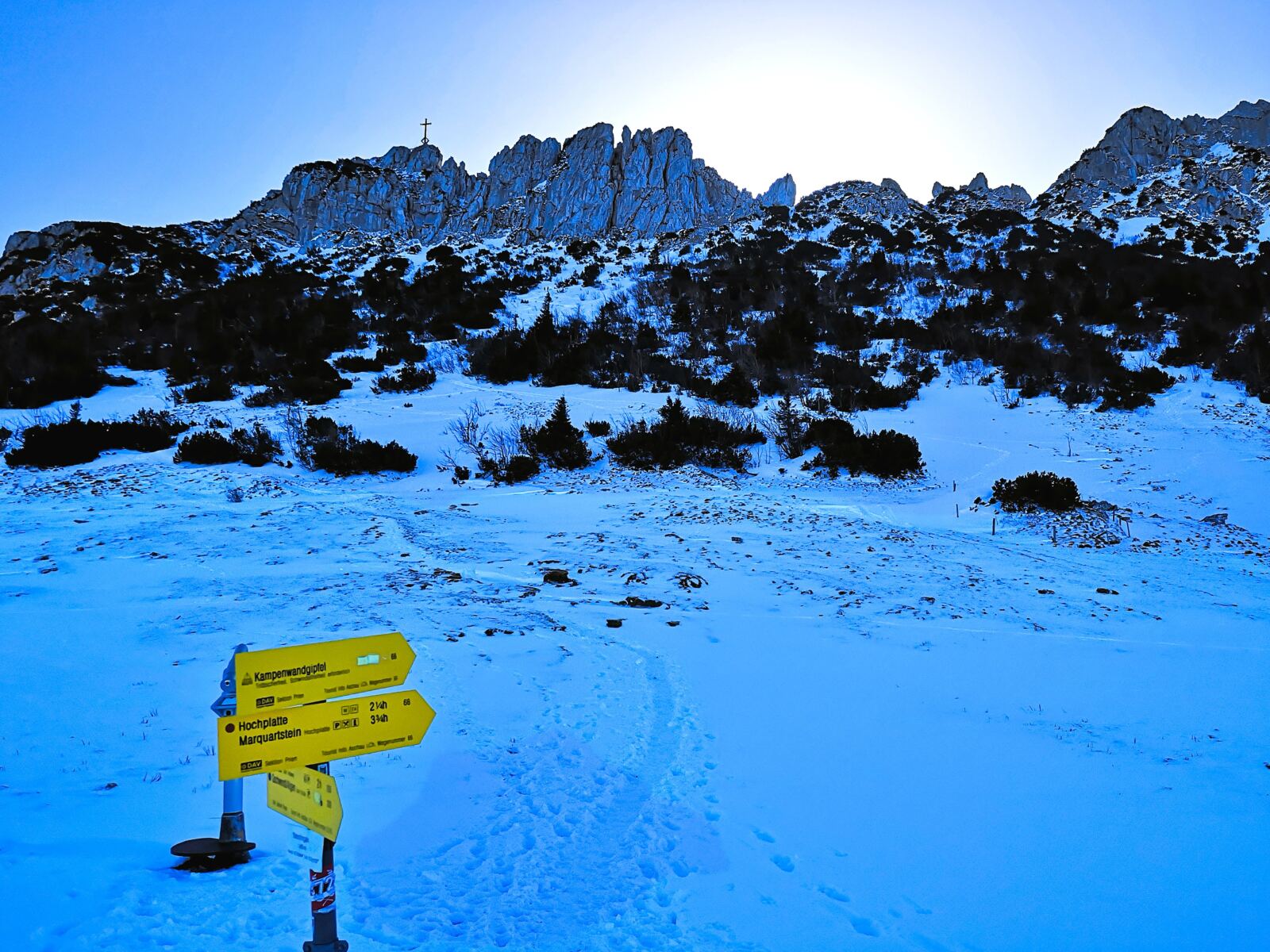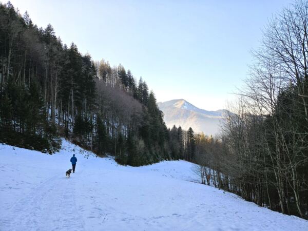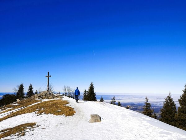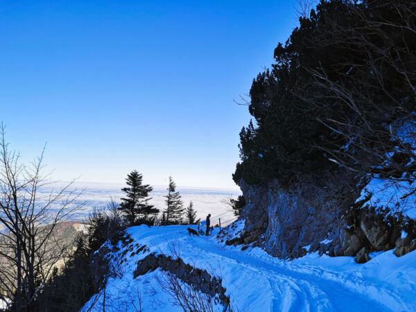 Die Bergstation im Rücken halten wir uns links Richtung Sonnenalm. Wir folgen dem Wanderweg ein kurzes Stück bergauf zu einem Andachtskreuz. Unser Weg verläuft nun kaum merkbar fallend um den Hahnenkamm der Kampenwand herum. Traumschön hier. Findet auch unser Hund, der im Galopp durch den Schnee peitscht. Bald passieren wir einen Weidezaun, der uns um diese Jahreszeit nicht weiter kümmert.