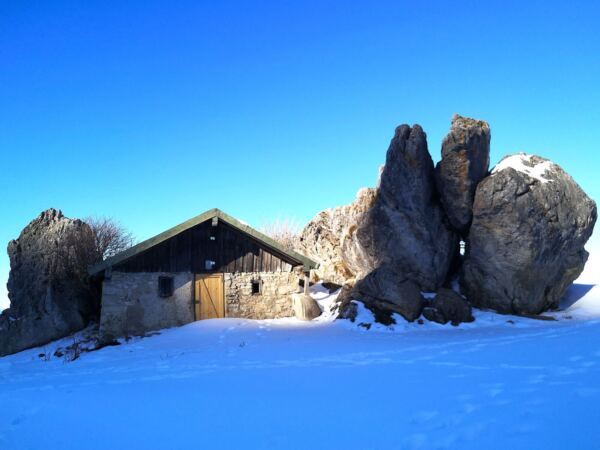 Nach einem Abstecher an der Kapelle laufen wir zurück, vorbei an der Steinlingalm und einer urigen kleinen Hütte, die uns sofort an das berühmte „Haus zwischen den Felsen“ (Maison entre les rochers, auch „Maison du Gouffre“) erinnert, an dem wir in der Bretagne vorbeigewandert sind. Hinter der Hütte beginnt der Abstieg.