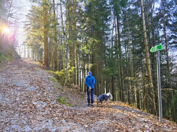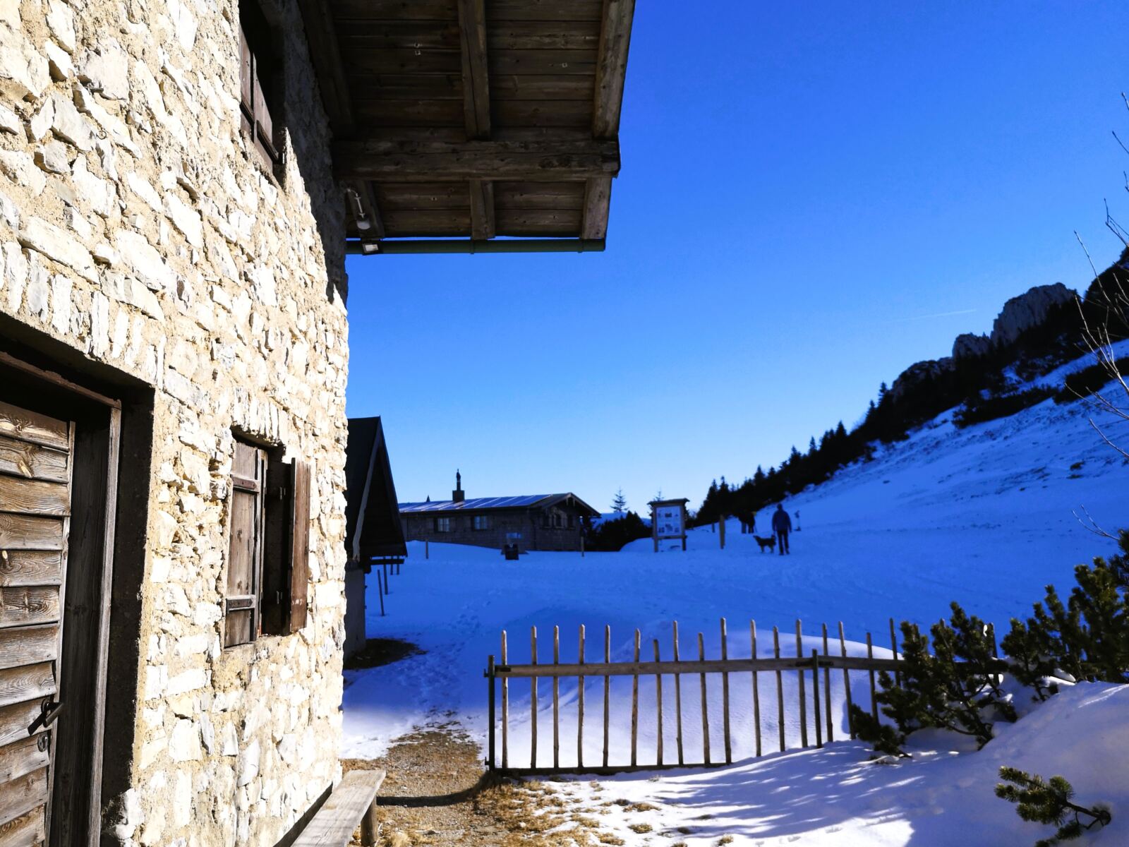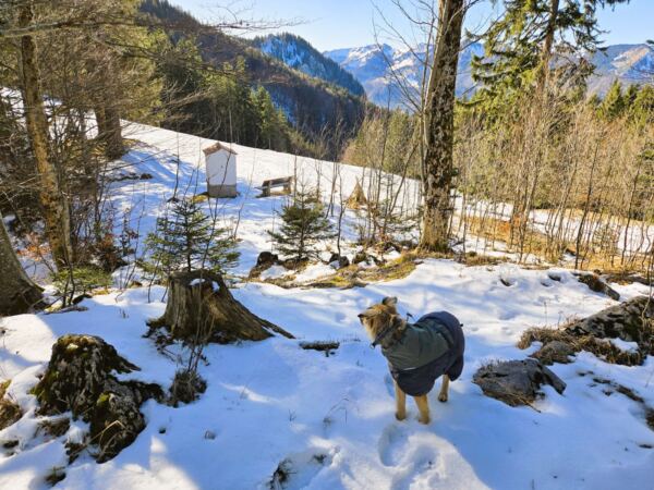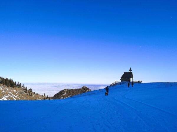 Bald sehen wir die Steinlingalm am Fuß des Ostgipfels, dahinter die Steinlingkapelle. Die kleine Kapelle aus Holz ehrt Josef Hell, der das weithin sichtbare und oft beleuchtete Chiemgau-Kreuz auf den Ostgipfel der Kampenwand gepflanzt hat. Mit 12 Metern ist es das höchste eiserne Gipfelkreuz der Bayerischen Alpen. Von der Steinlingalm führt ein Wanderweg hinauf zum Kreuz. Doch dieser Weg fordert auf den letzten Metern Schwindelfreiheit und Trittsicherheit. Nichts bei Eis und Schnee. Und gleich gar nichts für uns mit Hund.
