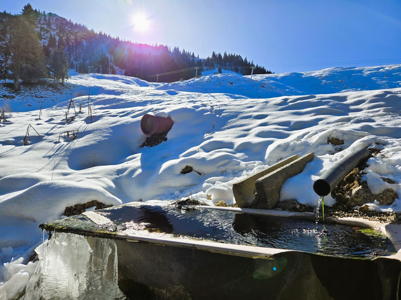 Nahe der Gorialm gluckern einige Bäche unter der Schneedecke. Unser Amos nutzt die Chance für ein Fußbad (dazu ist es nie zu kalt).