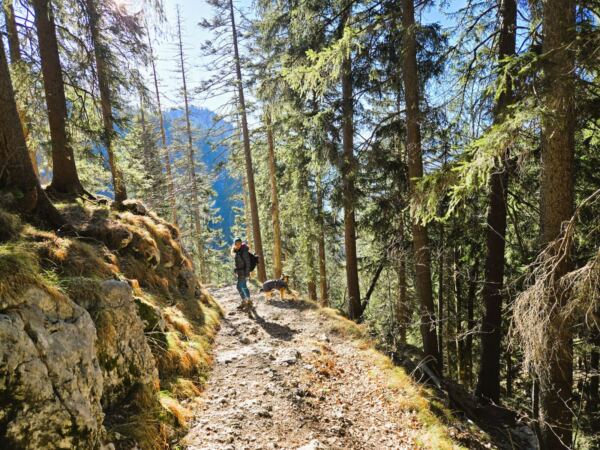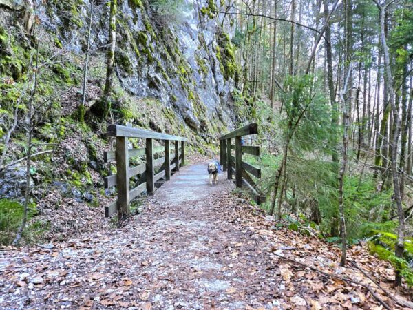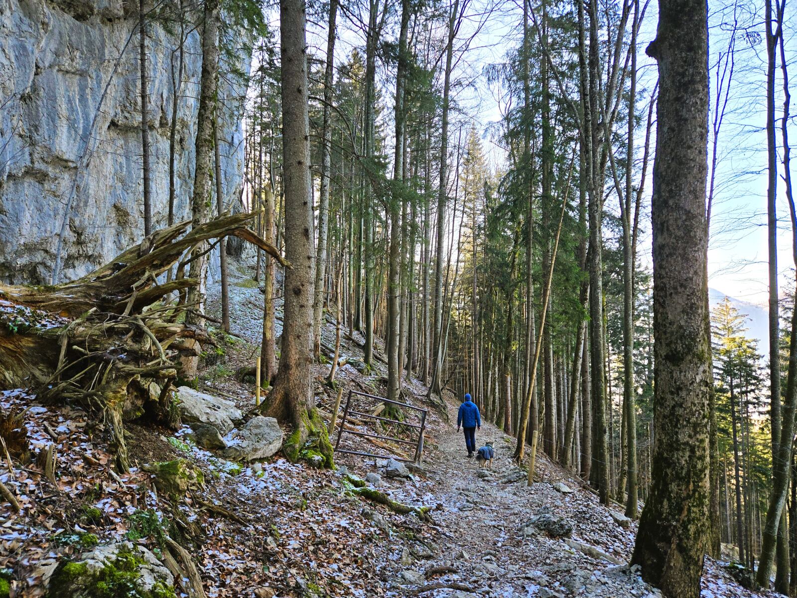 Unser Weg führt uns bald in den Wald hinein. Wir folgen zunächst dem Forstweg, biegen bei nächster Gelegenheit links ab auf einen schönen Steig, der Beschilderung Richtung Talstation folgend. Vorbei an steilen Felswänden und gewaltigen Gesteinsbrocken, die der Regen und die Zeit aus dem Berg gefressen haben, wandern wir weiter bergab, überqueren eine Lichtung, passieren ein Viehgatter – und stoßen wieder auf die Forststraße. Doch auch hier haben wir erneut die Möglichkeit, scharf links ab auf einen beschilderten und wieder sehr schönen Steig Richtung Talstation zu wechseln. Bald passieren wir einen Bach, den Amos zum plantschen und auftanken nutzt.