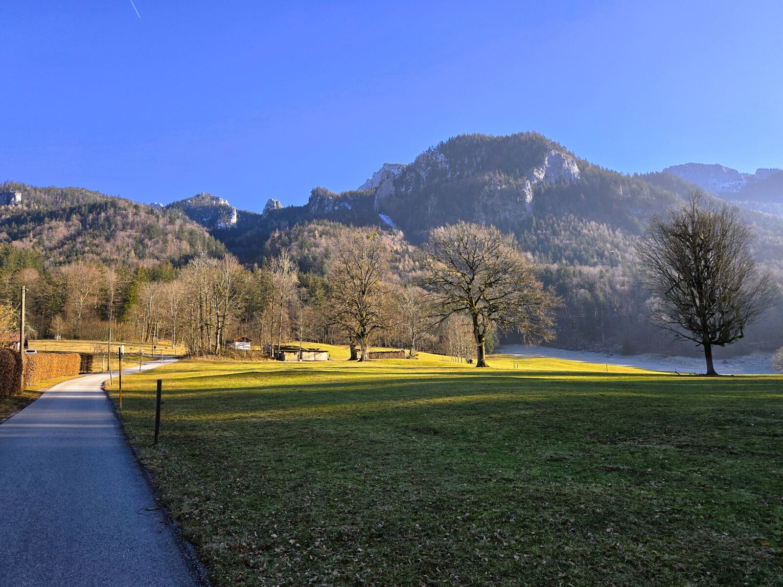Der Steig mündet wieder auf den Forstweg. Nach wenigen Metern erreichen wie die ersten Häuser von Hohenaschau. Wir folgen der nun geteerten Straße zur Talstation.