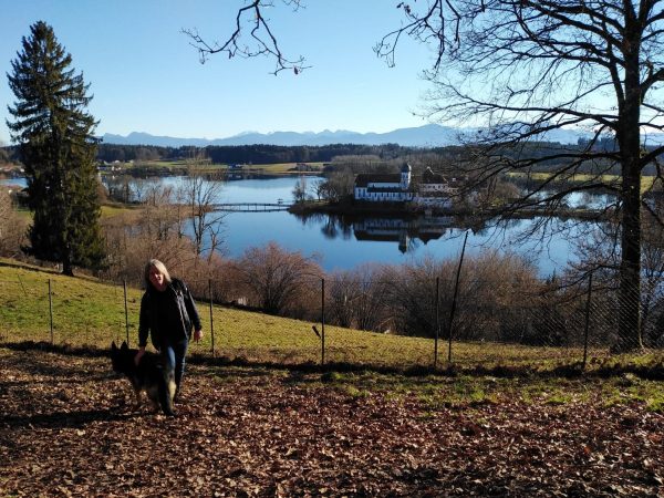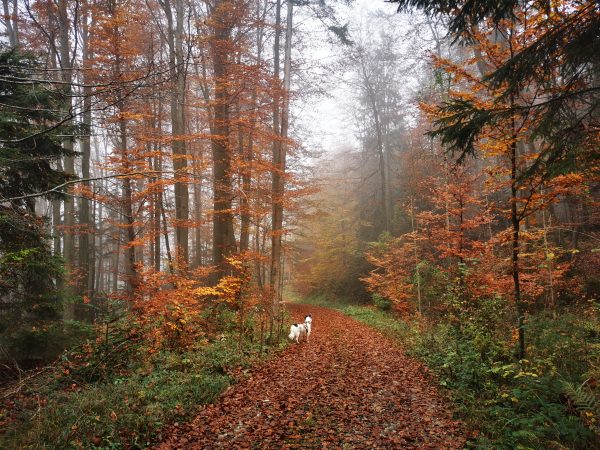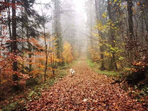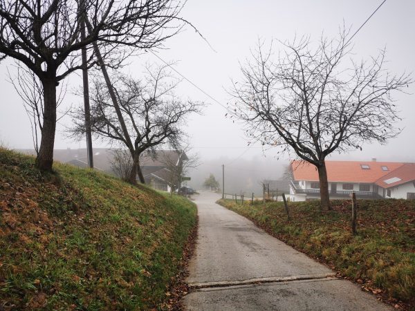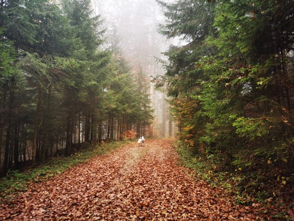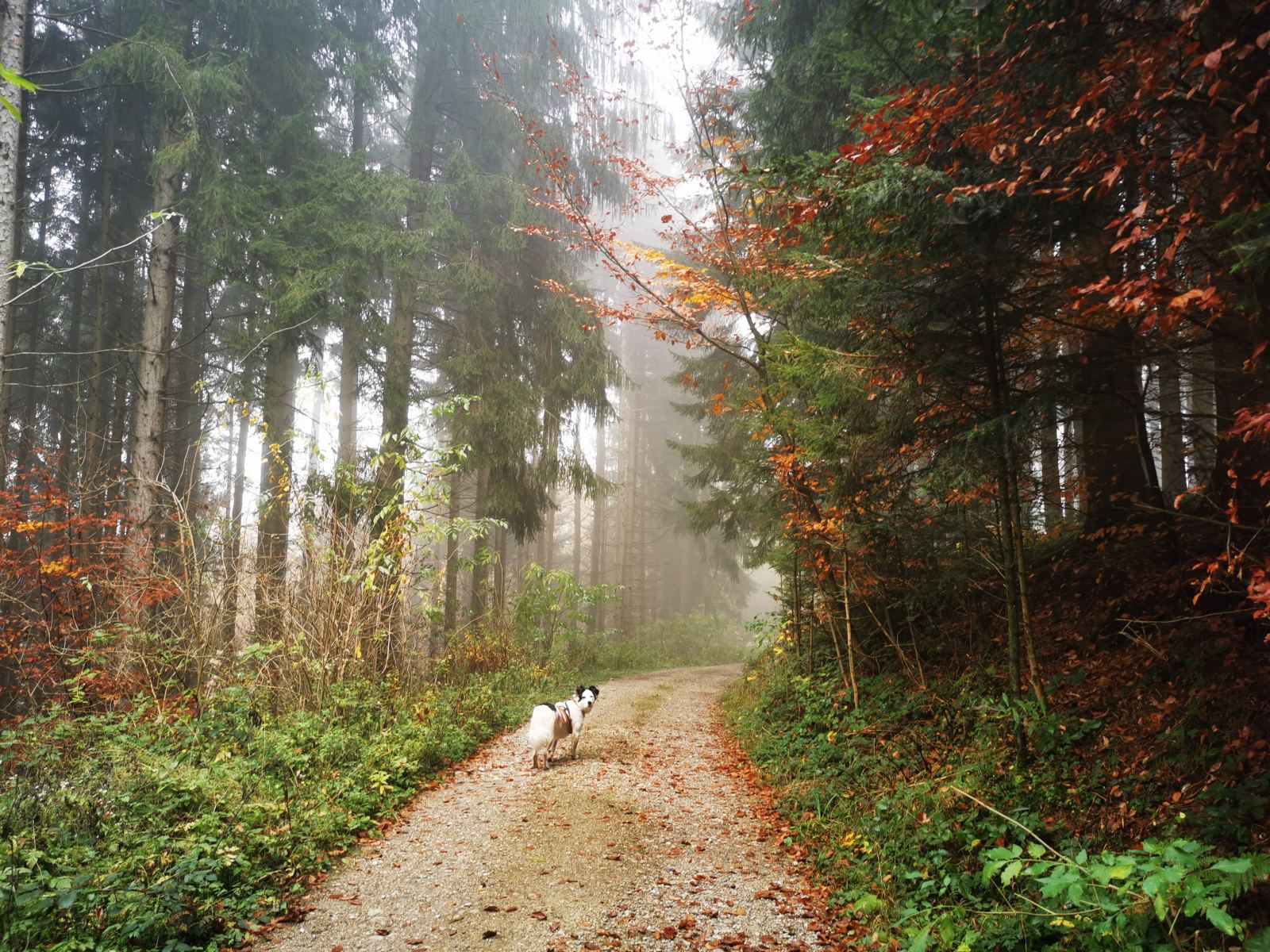 Der Weg ist angenehm zu gehen und führt an Höfen und Weiden vorbei, bis man in einen Wald kommt.