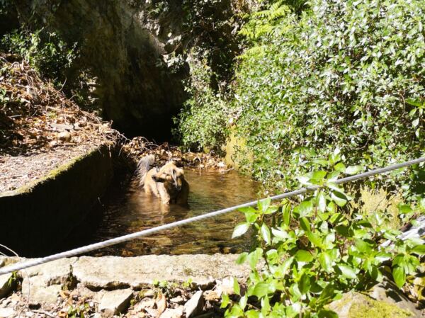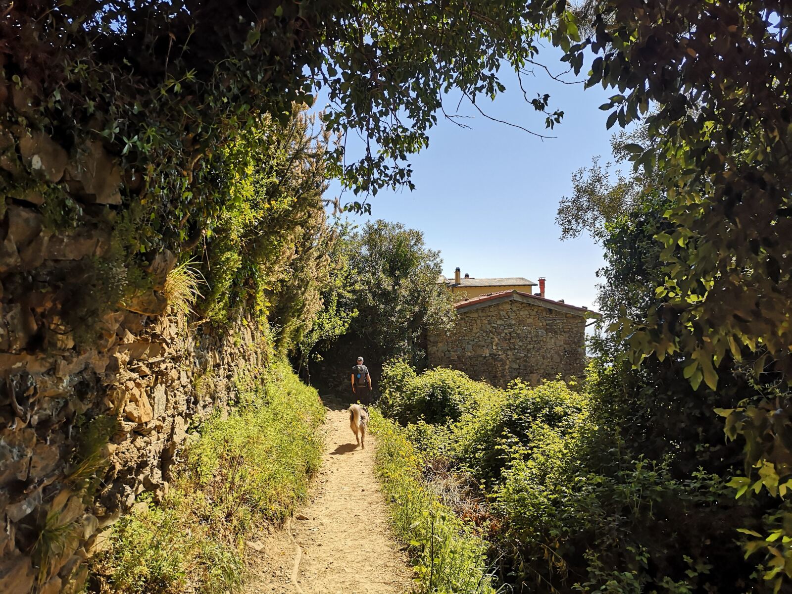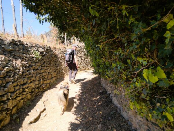 Der Weg bringt uns schnell raus aus dem Ort und bergauf in den Wald. Nach einem recht knackigen Anstieg erreichen wir eine Wegkreuzung. Hier halten wir uns rechts Richtung Volastra. Der Weg wir jetzt ebener und bringt uns weiter durch den Wald. Hinter einem dicht bewachsenen Wasserlauf – unser Hund findet seinen Badebereich einige Schritte später in einem gemauerten Becken – öffen sich die Landschaft. Wir laufen durch Porciana, nur eine Handvoll liebevoll renovierter Häuser, und schließlich hinein in die herrliche Landschaft der Trockenmauern und Weinberge.
