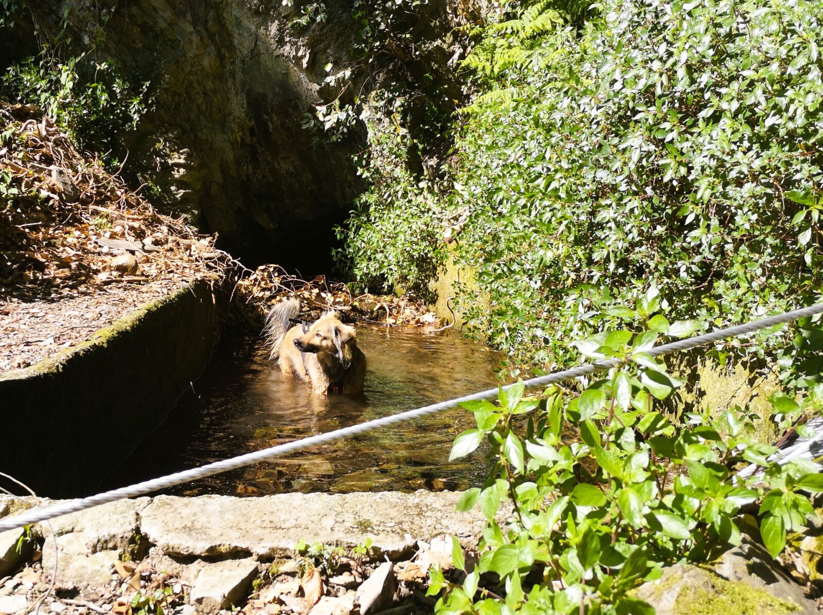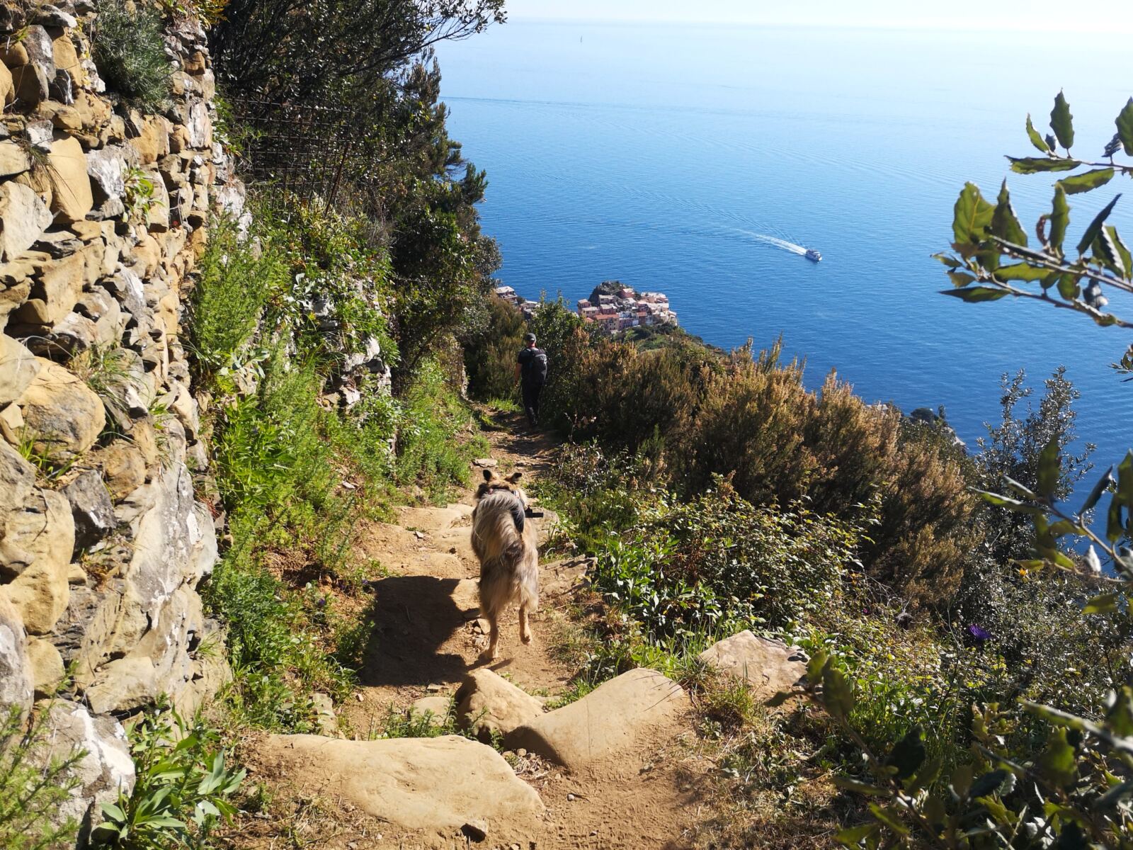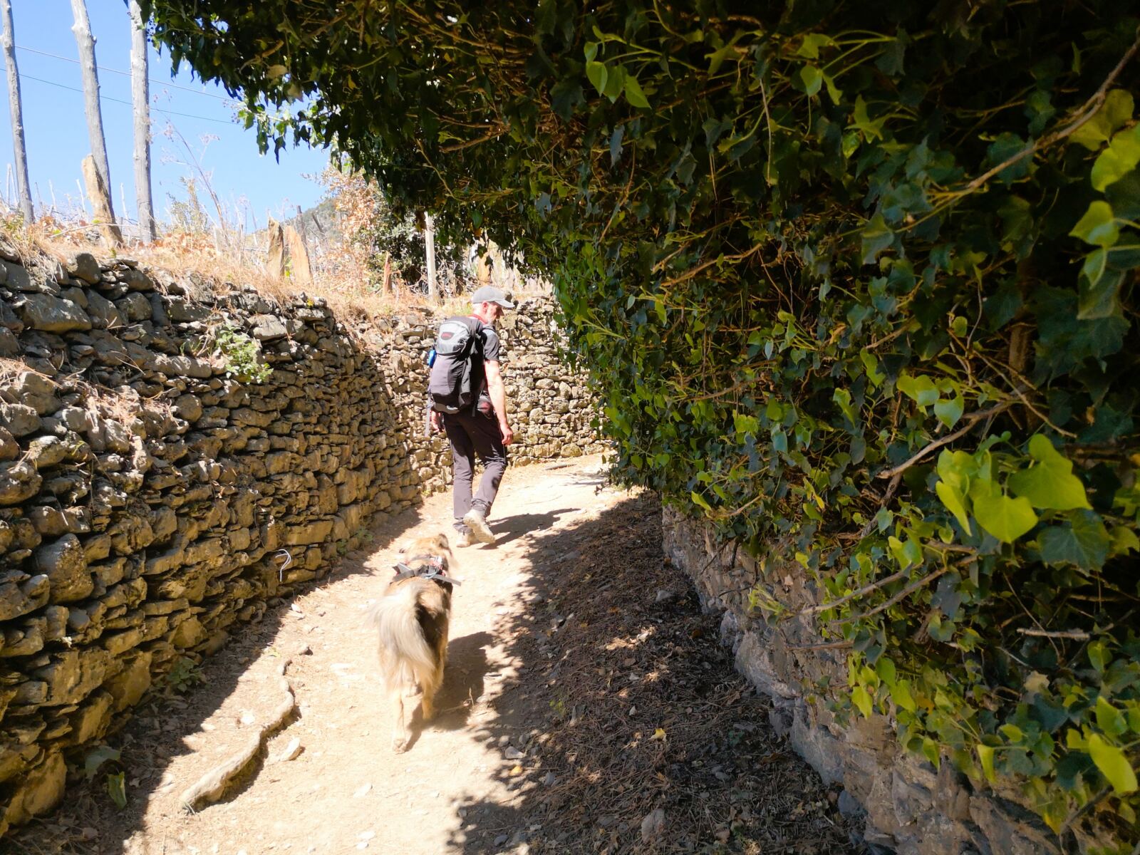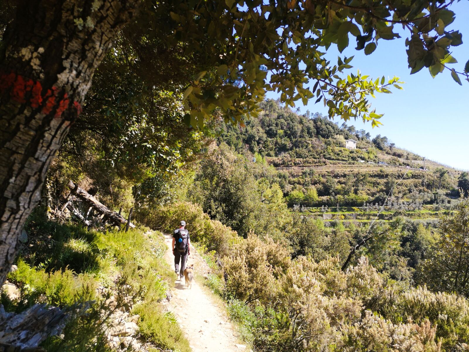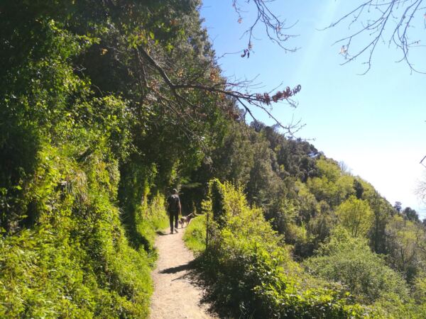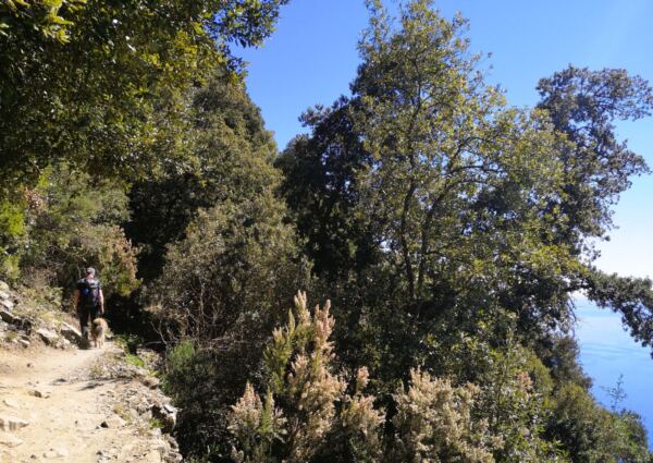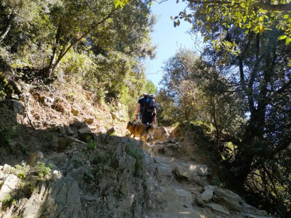 Der Aufstieg aus Corniglia führt zunächst durch Wald mit immergrüner Macchia, Steineichen und Pinien. An warmen Tagen kann das stellenweise etwas schweißtreibend werden. Einzelne Felsstufen fordern die Sprungkraft unseres Hundes. Zum Glück verläuft der Weg lange im Schatten. 🐾🌳 Weiterer Pluspunkt: Es gibt einen Wasserlauf zur Abkühlung.