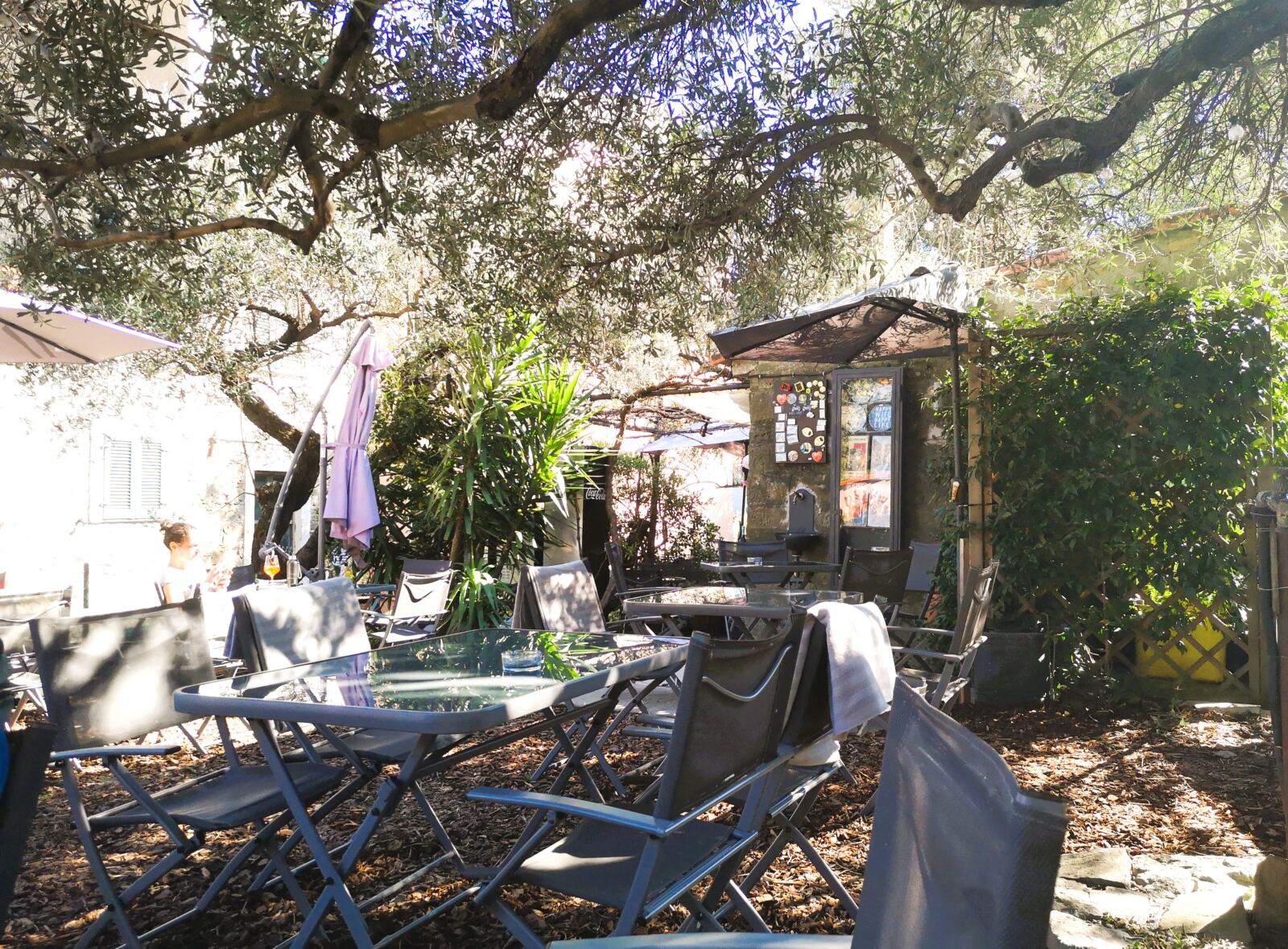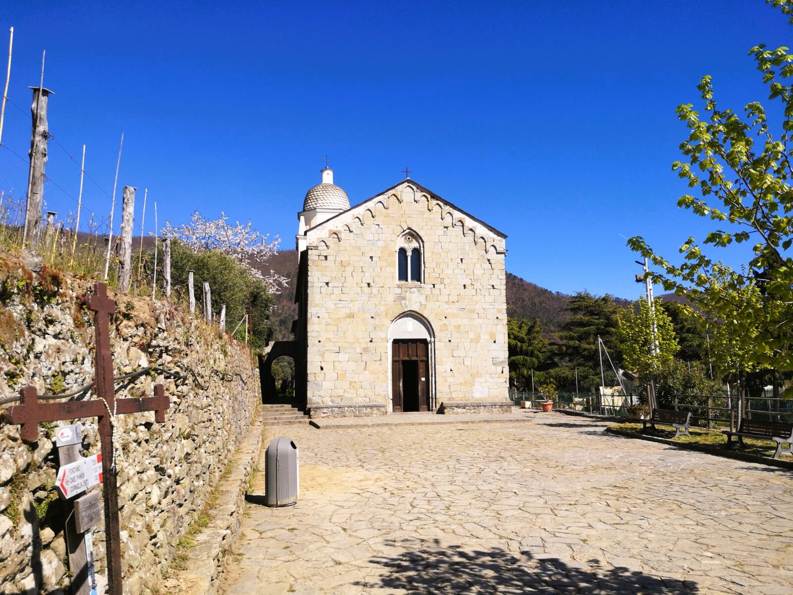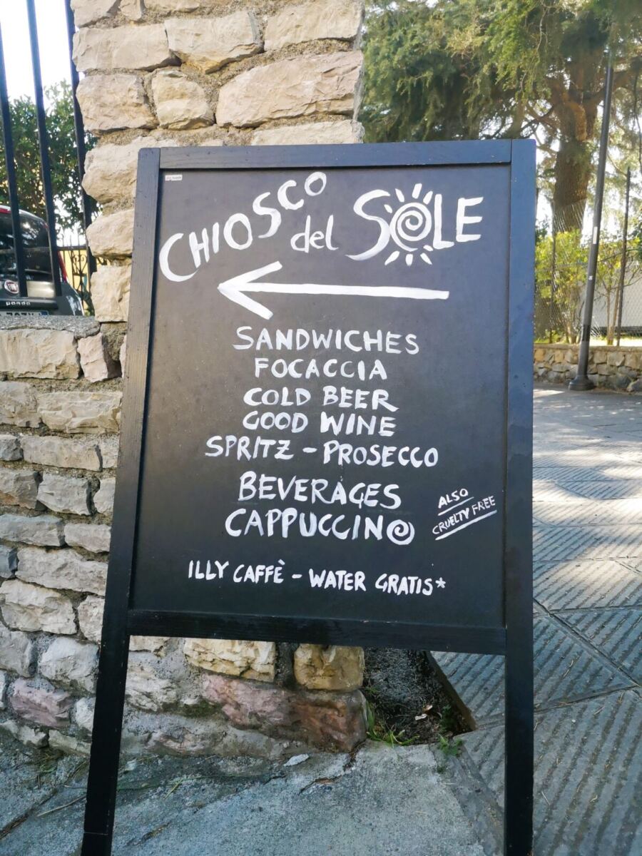 Schließlich erreichen wir Volastra mit dem großen Vorplatz der Kirche Santuario di Nostra Signora della Salute. Reinschauen lohnt sich. An der Kirche finden sich auch Picknickbänke. Wir laufen rechts an der Kirche vorbei, dahinter wieder rechts und entdecken den Zugang zum Chiosco del Sole mit seinem großartigen Garten. Nach Kaffee, Kuchen und einem Nickerchen für den Hund geht’s weiter.