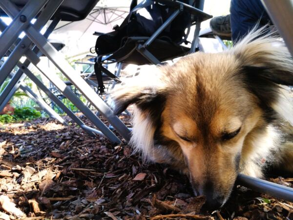 Zwischen Auf- und Abstieg liegt unser Etappenziel: das kleine Bergdorf Volastra, ein Ruheort über dem Meer. Gleich hinter der Kirche liegt unsere bisherige Lieblings-Cafè-Bar an der Riviera di Levante: das winzige Chiosco del Sole („Kiosk der Sonne“). Ein großes Angebot regionaler Leckereien, ein großer Gastgarten mit Oliven- und Feigenbäumen und mit Rindenmulch auf dem Boden. Amos hat sich sofort eingerollt und ein Nickerchen gehalten. Wir hätten ewig sitzen bleiben können. ☕🌿