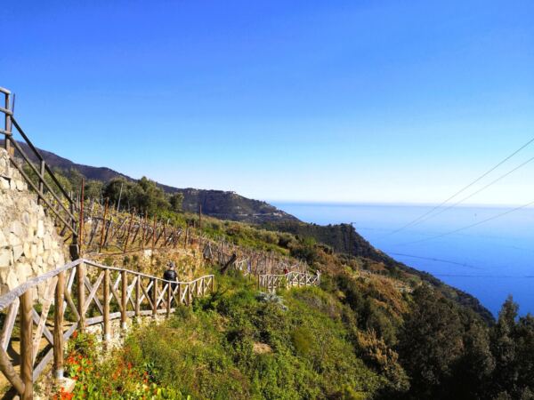 Oberhalb der Küste öffnet sich die berühmte Terrassenlandschaft der Cinque Terre: jahrhundertealte Weinberge, gehalten von unzähligen Trockenmauern. Diese einzigartige Kulturlandschaft gehört heute zum Welterbe der UNESCO.