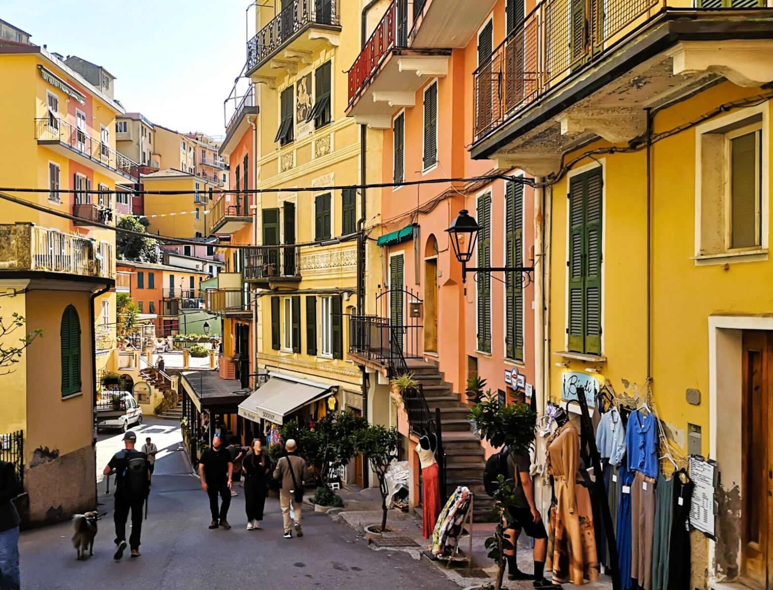 Der berühmte Ort rückt mehr und mehr in unseren Blick. Unser Pfad mündet auf ein paar letzte Treppenstufen. Dann stehen wir auf der Via Discovolo. Wir halten uns rechts und bergab. Vorbei an bunten Fassaden, Restaurants und etlichen schönen Geschäften (nicht nur Andenken) erreichen wir den winzigen Hafen mit den abenteuerlich in die Felsen geklebten Häusern. Auch in diesem Hafen mit Badestelle sind Hunde nicht im Wasser erlaubt.