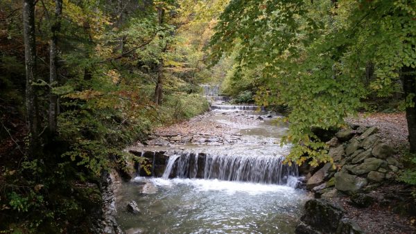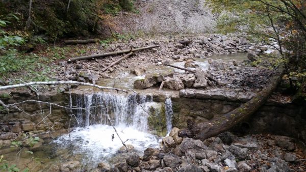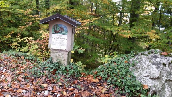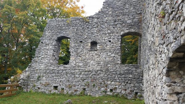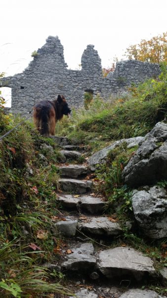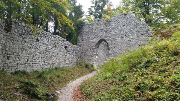 Im Tal halten wir uns rechts und stoßen wieder auf den Lahnenwiesgraben, den wir mittels Brücke überqueren. Nächste Station: Die Ruine der Burg Werdenfels. Dafür geht es wieder bergan. Ei schmaler Pfad zweigt links zu unserem Ziel ab und führt über Wurzeln und Treppen zur Ruine.