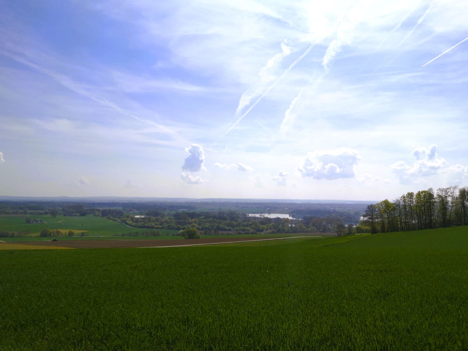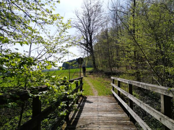 Kurz nach der zweiten Schutzhütte dreht unser Weg nach rechts in südliche Richtung. Wir passieren schließlich eine lange Holzbrücke und erreichen offenes Gelände. Weite Felder, eingerahmt von Wald. Über Feldwege laufen wir über den Höhenweg hinüber in Richtung Ortsteil Schäfstall. Bei klarem Wetter verwöhnt uns ein schöner Weitblick auf das Donautal.