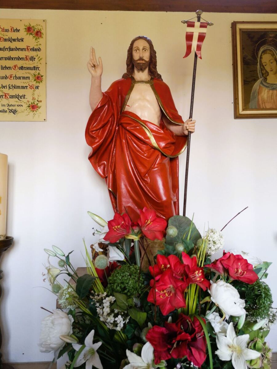 Wir erreichen den Segelflugplatz und legen hier noch eine Rast ein. Dann halten wir uns rechts und spazieren auf dem breiten befestigten Wirtschaftsweg entlang des Segelflugplatz Richtung Wald. Unser Wanderweg biegt links ab. Am Waldrand leitet uns der Weg zur Auferstehungskapelle, die auf einer Wiese über Zirgesheim thront.