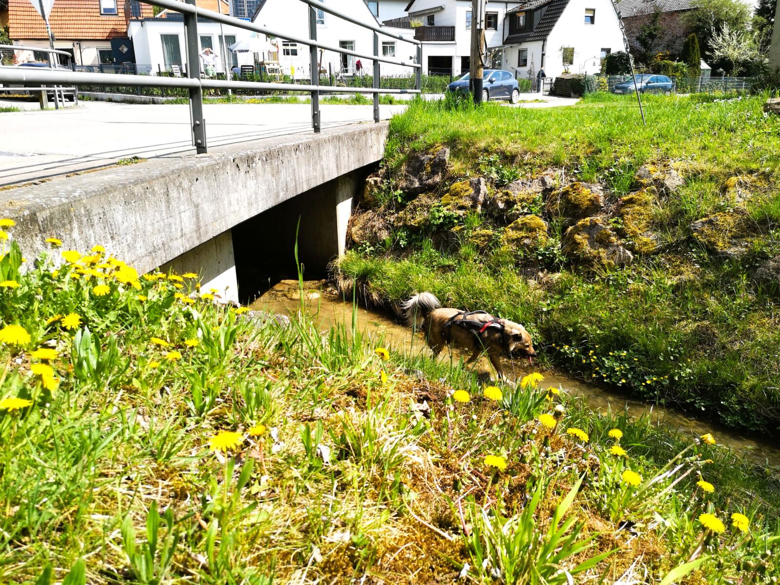 Zwischen Streuobstwiesen laufen wir hinab nach Zirgesheim. Hier treffen wir auf einen Wasserlauf. Amos nutzt begeistert die Gelegenheit für ein kühles Bad. Der Wanderweg bringt uns an der Kirche vorbei wieder bergauf auf einem Teersträßchen. Wir biegen scharf links ab und erreichen den Grillplatz am Kreuz auf dem Wichtelesberg. Bei Föhnlage zeigen sich von hier aus die Alpen am Horizont. Heute hängt der Duft nach Würstchen in der Luft. An diesem schönen Tag nutzen gleich zwei Familien den Grill.