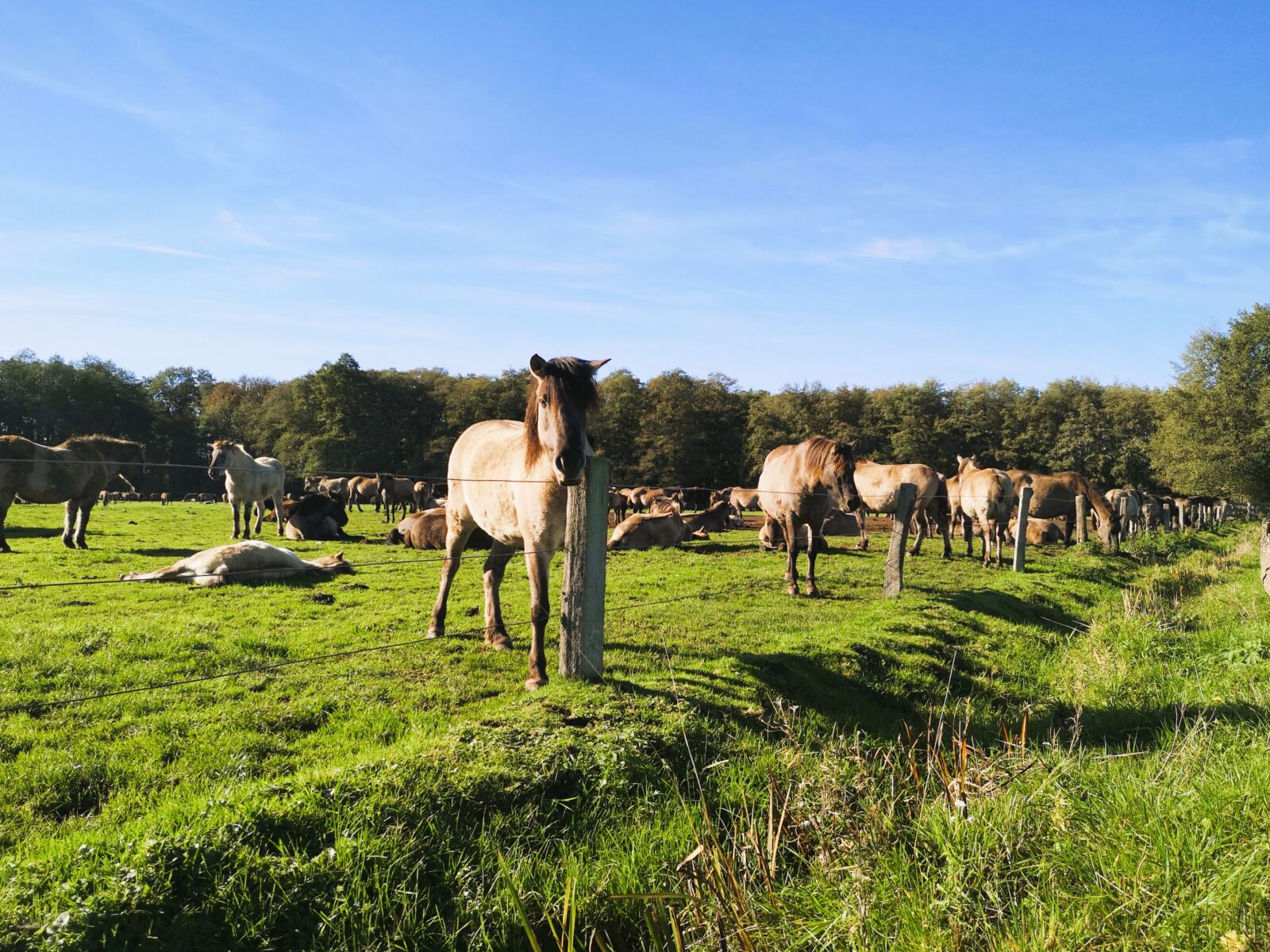 Pferdefans kennen die Bilder von diesem Spektakel: eine Herde wilder Pferde in allen Schattierungen zwischen braun und grau sprengt im Galopp an einer Menschenmenge vorbei, dazwischen junge Hengste, die dagegen ankämpfen, von ihrer Gruppe getrennt zu werden. An jedem letzten Samstag im Mai wiederholt sich das Schauspiel im Merfelder Bruch nahe der Stadt Dülmen. Der Wildpferdefang lockt tausende Schaulustiger an – und das schon seit 1907. Doch die Geschichte der Wildpferde geht viel weiter zurück, mindestens bis ins Jahr 1306, als die Herde erstmals urkundlich erwähnt wurde. Von Mitte März bis Anfang November können wir die knapp 400 wilden Pferde im Merfelder Bruch an Wochenenden und Feiertagen besuchen. Von 10 bis 18 Uhr ist der Einlass zu dem umzäunten Naturschutzgebiet geöffnet (Eintritt), angeleinte Hunde sind ebenfalls willkommen. Das Gelände ist sehr weitläufig. Ein Besuch bei den Pferden lässt sich also ganz entspannt mit einem kleinen Hundespaziergang verbinden. 🐕🦺🐎