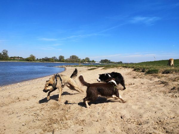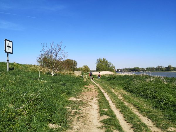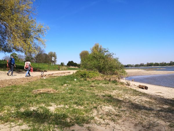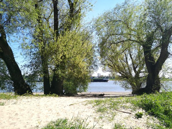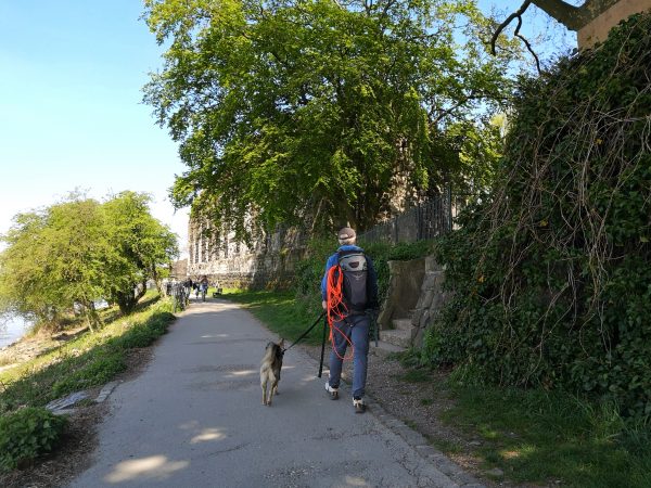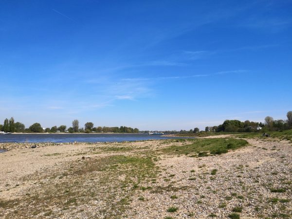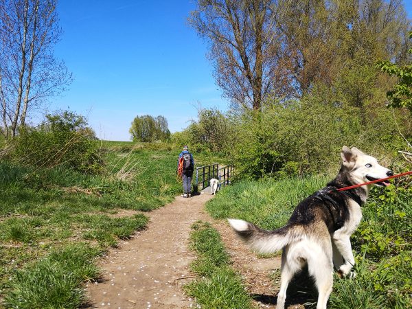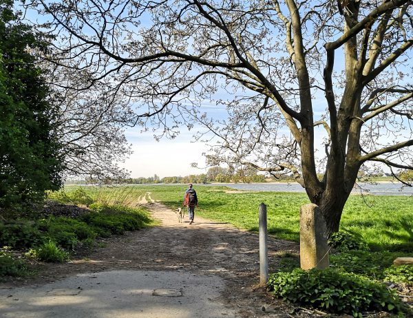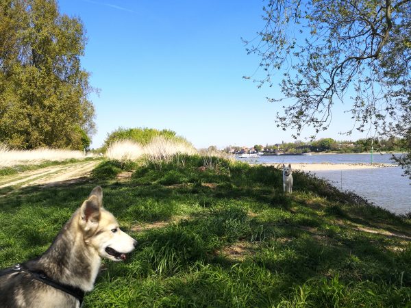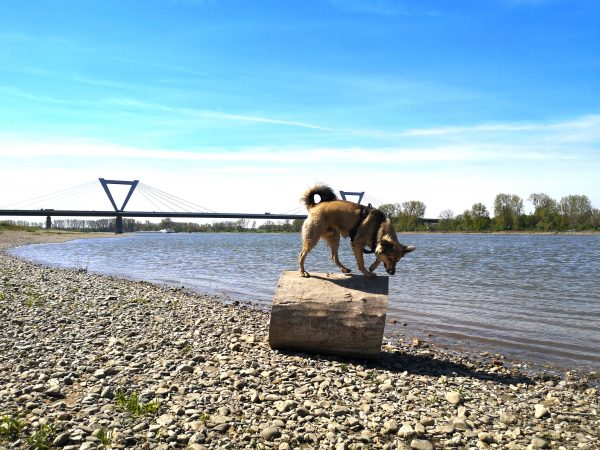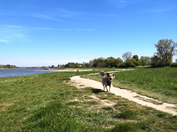 Ganz egal, wie oft wir diese Runde machen: Es fühlt sich immer wie Urlaub an. Los geht`s in Kaiserswerth mit seinen Alleen und historischen Fassaden. Vom Parkplatz An St. Swidbert laufen wir vorbei am Restaurant Alte Rheinfähre und weiter ans Rheinufer. Hier liegen sogar Muscheln im Sand – für noch mehr Urlaubsfeeling. Immer schnurgeradeaus auf dem Wiesenpfad folgen wie dem Strom Richtung Flughafenbrücke. Mit etlichen Zwischenstopps für Spiel- und Planschpausen mit neuen vierbeinigen Freunden, die Amos unterwegs trifft. An der Flughafenbrücke halten wir uns links. Wir laufen durch die Wiesen hinauf zum Treppenaufgang auf die Flughafenbrücke. Die Brücke, auf der sich Fußgänger und Radler eine Spur teilen, bringt uns über den Rhein. Wir queren den Radweg, laufen durch die Wiese zum Wanderweg am Flussufer und halten uns links in die Richtung, aus der wir gekommen sind. Eine kleine Brücke führt uns wenig später über den Mühlenbach. Zwischen Rhein und weiten Wiesen, später Ackerflächen, spazieren wir weiter bis zum Fähranleger in Meerbusch. Im Restaurant Bellevue im Rheinhotel Vier Jahreszeiten böte sich die nächste Möglichkeit zur Einkehr. Wir haben aber einen anderen Plan. Mit der Fähre Michaela II., die sich nie eine Pause gönnt, setzen wir über den Fluss. Vor dem Biergarten des Restaurants Alte Rheinfähre biegen wir links ab und laufen vor zum nächsten Biergarten, dem „Burghof“. Apfelpfannkuchen und Leberkäs` (freut sich auch der Hund) unter mächtigen Kastanien, dazu das Tuckern der Schubverbände. Herrlich entspannend. Zum Schluss statten wir noch der Kaiserpfalz Kaiserswerth einen kurzen Besuch ab.