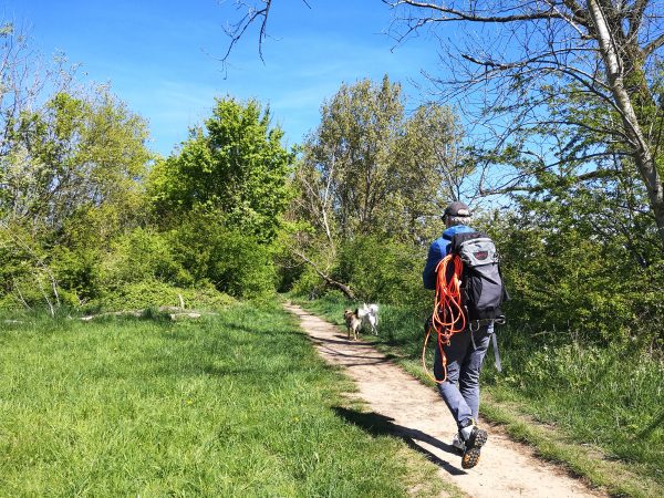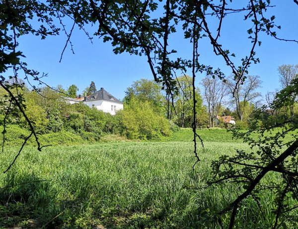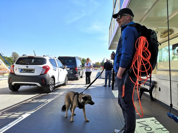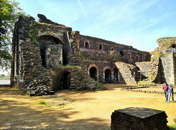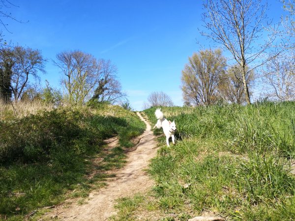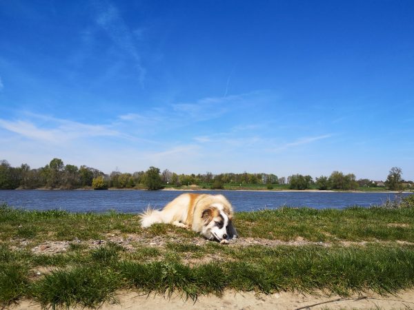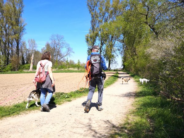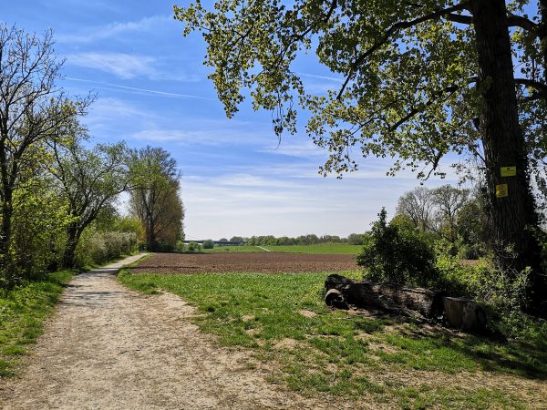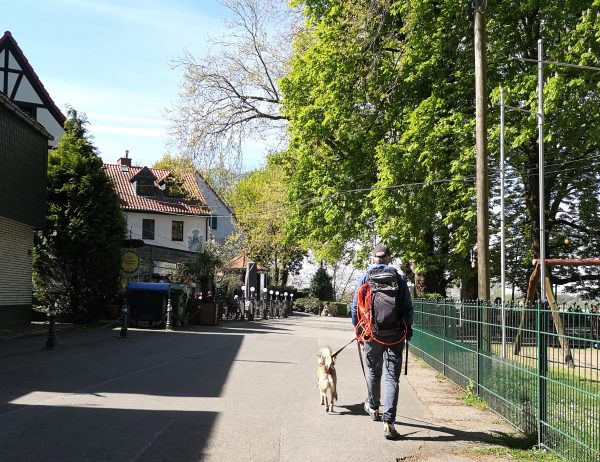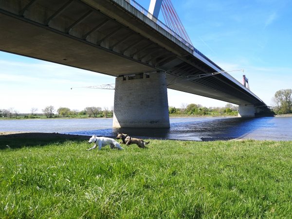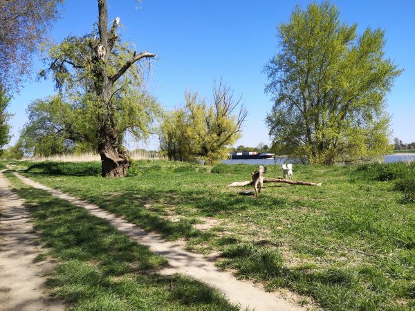 Ganz egal, wie oft wir diese Runde machen: Es fühlt sich immer wie Urlaub an. Los geht`s in Kaiserswerth mit seinen Alleen und historischen Fassaden. Vom Parkplatz An St. Swidbert laufen wir vorbei am Restaurant Alte Rheinfähre und weiter ans Rheinufer. Hier liegen sogar Muscheln im Sand – für noch mehr Urlaubsfeeling. Immer schnurgeradeaus auf dem Wiesenpfad folgen wie dem Strom Richtung Flughafenbrücke. Mit etlichen Zwischenstopps für Spiel- und Planschpausen mit neuen vierbeinigen Freunden, die Amos unterwegs trifft. An der Flughafenbrücke halten wir uns links. Wir laufen durch die Wiesen hinauf zum Treppenaufgang auf die Flughafenbrücke. Die Brücke, auf der sich Fußgänger und Radler eine Spur teilen, bringt uns über den Rhein. Wir queren den Radweg, laufen durch die Wiese zum Wanderweg am Flussufer und halten uns links in die Richtung, aus der wir gekommen sind. Eine kleine Brücke führt uns wenig später über den Mühlenbach. Zwischen Rhein und weiten Wiesen, später Ackerflächen, spazieren wir weiter bis zum Fähranleger in Meerbusch. Im Restaurant Bellevue im Rheinhotel Vier Jahreszeiten böte sich die nächste Möglichkeit zur Einkehr. Wir haben aber einen anderen Plan. Mit der Fähre Michaela II., die sich nie eine Pause gönnt, setzen wir über den Fluss. Vor dem Biergarten des Restaurants Alte Rheinfähre biegen wir links ab und laufen vor zum nächsten Biergarten, dem „Burghof“. Apfelpfannkuchen und Leberkäs` (freut sich auch der Hund) unter mächtigen Kastanien, dazu das Tuckern der Schubverbände. Herrlich entspannend. Zum Schluss statten wir noch der Kaiserpfalz Kaiserswerth einen kurzen Besuch ab.