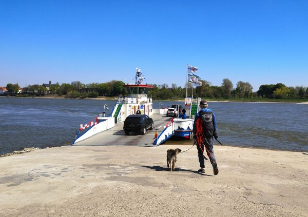 Einer von vielen schönen Perspektiven auf dieser Runde: Blick vom Meerbuscher Rheinufer auf Kaiserwerth und die Rheinfähre, die unermüdlich hin und her schippert.
