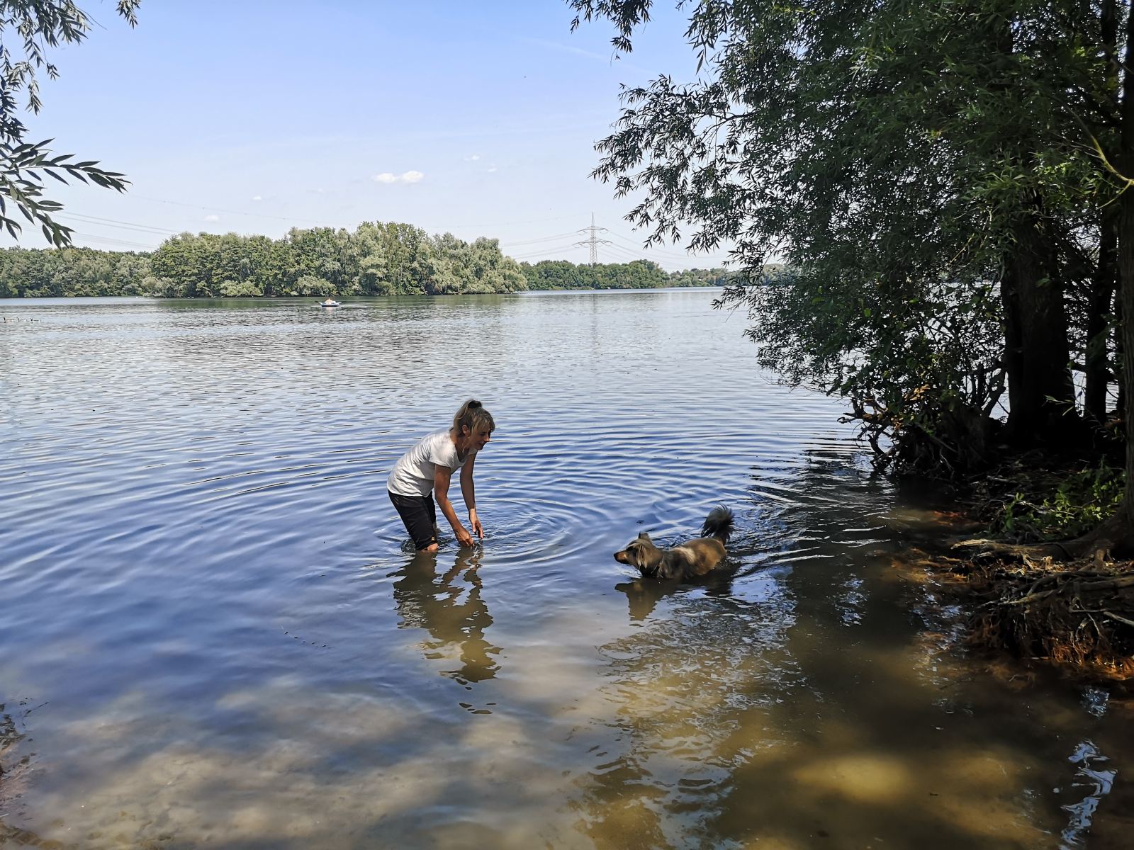 Abtauchen im See. Frauchen hat den Badeanzug daheim an der Garderobe vergessen. Hitze schlägt offenfar aufs Hirn. :-) Unser Amos hat immer alles dabei.