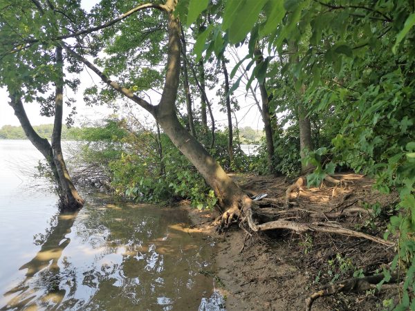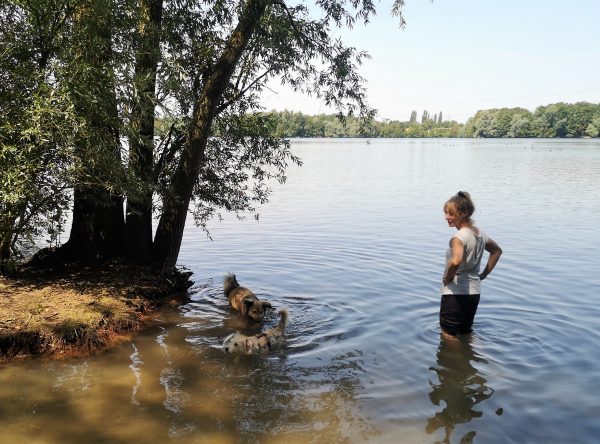 Im See liegen zwei Inseln, die allerdings nicht betreten werden dürfen. Am See stehen Bäume dicht an dicht, etliche mit den Wurzeln im Wasser. Rund um den See zieht sich ein befestigter, knapp 5 km langer Wanderweg. Der ist bei jedem Wetter begehbar, auch nach starken Regenfällen. In einer guten Stunde lässt sich der See auf diesem Rundweg locker umrunden. Hier gilt keine Leinenpflicht, wohl aber an den Liegewiesen und Grillplätzen. Macht nichts. Entlang des Sees finden sich immer wieder kleine wilde Buchten, an denen wir einen ganzen Badetag verbringen können, ohne hundelose Menschen zu stören.