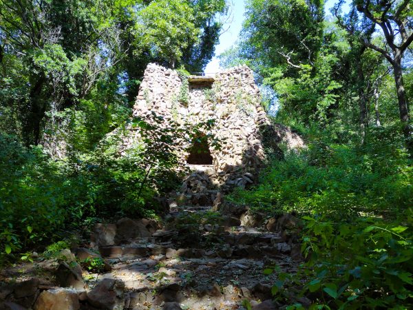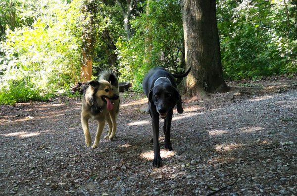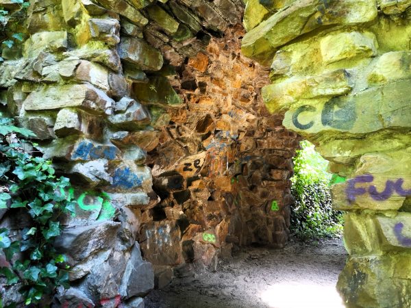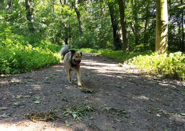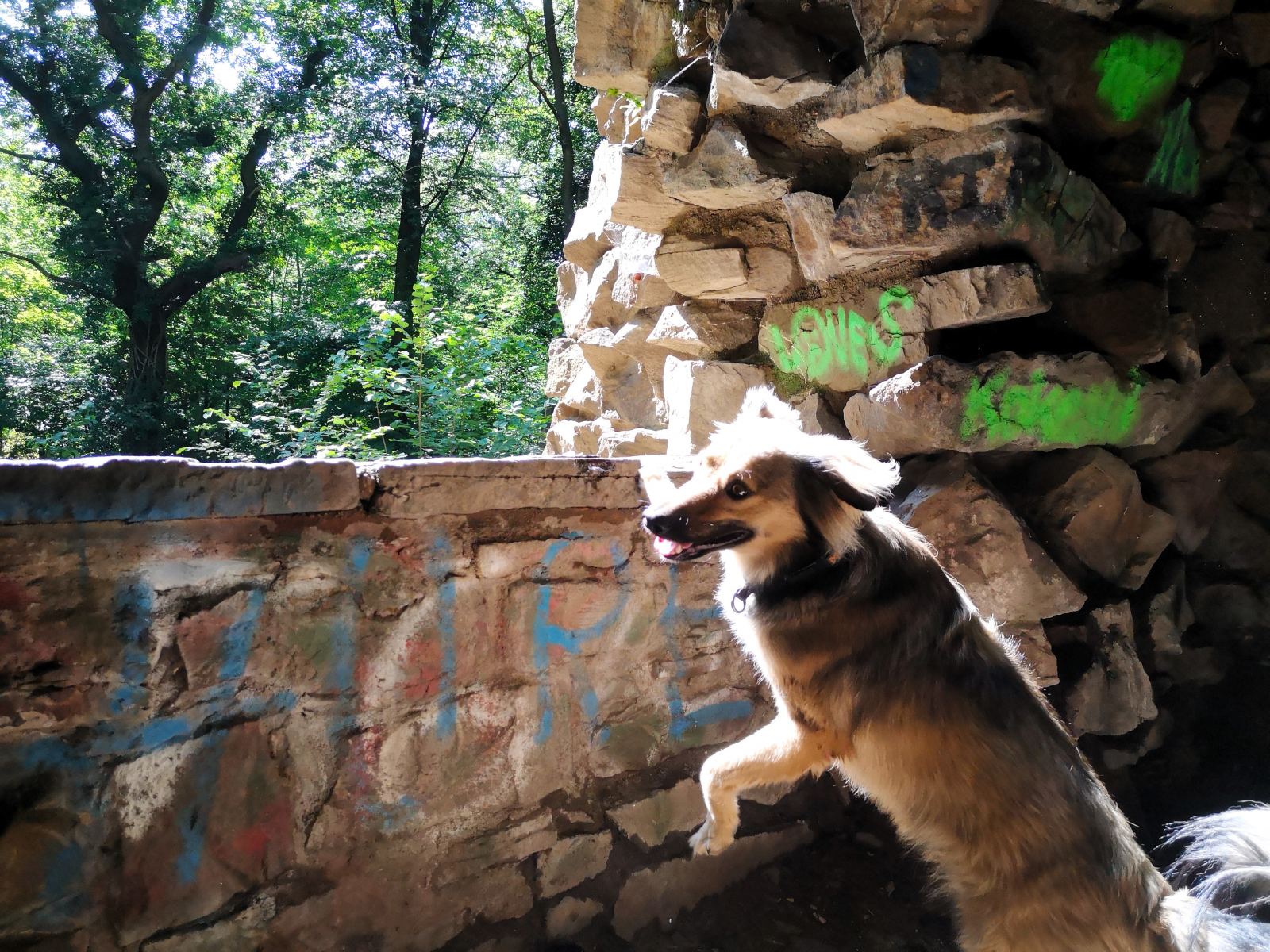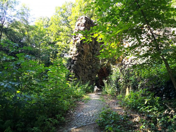 Ein besonders schönes Eckchen im Duisburger Stadtwald ist der Kaiserberg. Im Schatten hoher Bäume darf unser Hund nicht nicht nur frei laufen. Hier trifft er auch verlässlich auf Spielkameraden. Und seine Leute haben jede Menge Historisches zu entdecken. Die Gesichte des Kaiserberg reicht weit zurück in die Vergangenheit. Schon vor  vielen tausend Jahren galt die natürliche Erhebung im heutigen Stadtteil Duissern als strategisch wichtiger Aussichtspunkt, ideal für Befestigungsanlagen. Die Anlagen sind verschwunden, ebenso der Wasserturm. Und wo einst das Kaiser-Wilhelm-Denkmal stand, spielen heute Hunde auf der weiten Wiese. Doch die künstliche Grotte darunter, 1898 als Teil des Kaiser-Denkmals angelegt, steht noch. Im Original. Hier könnte der Froschkönig wohnen. Der Wasserlauf davor ist trocken gefallen, dennoch spannend zum Abschnüffeln. Ein Teil des Kaiserberg gehört heute zum Zoo Duisburg. Also nicht wundern, wenn man manchmal Urwaldrufe durch den Wald herüberhallen. Beim ersten Spaziergang ist unser Amos heftig zusammengezuckt. 🙂