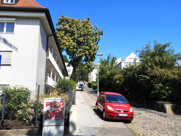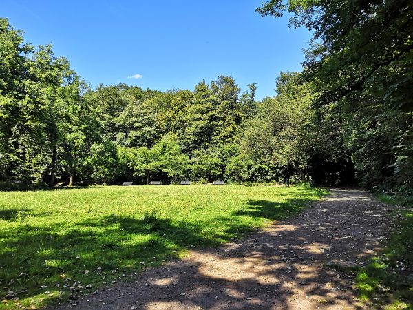 Wir starten unseren Spaziergang im noblen Villenviertel Wilhelmshöhe.  Auf der Straße „Am Freischütz“ laufen wir geradeaus in den Wald und erreichen direkt die Grotte.