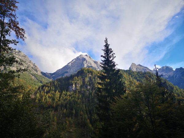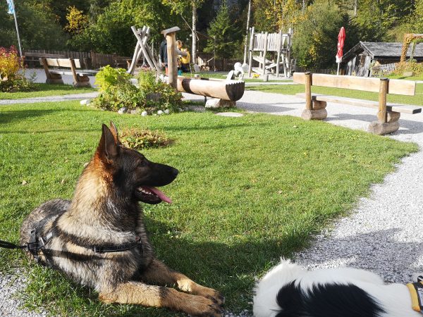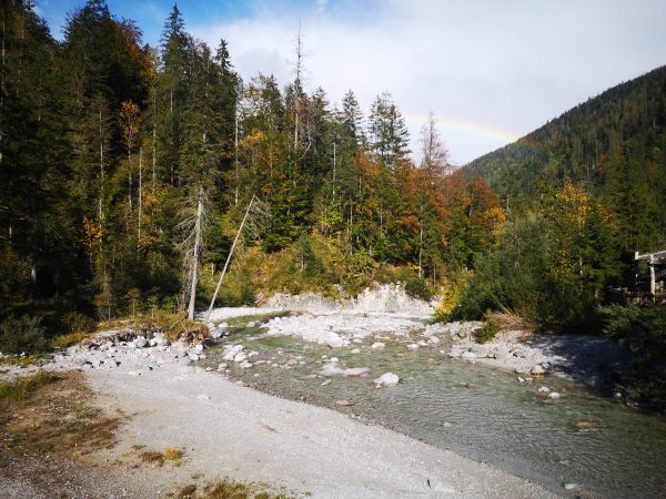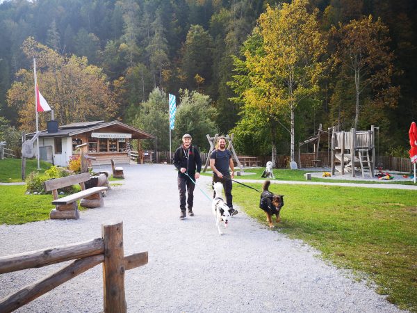 Wir starten am kostenpflichtigen Wanderparkplatz (4 Euro). Man kann auch einen Parkplatz weiter fahren und direkt am Eingang der Klamm starten (kostenloser Parkplatz), der Weg dorthin am Wasser entlang ist aber auch sehr schön. Es geht über weiße Schotterbänke, die Hunde nutzen den Bach für viele Badepausen.