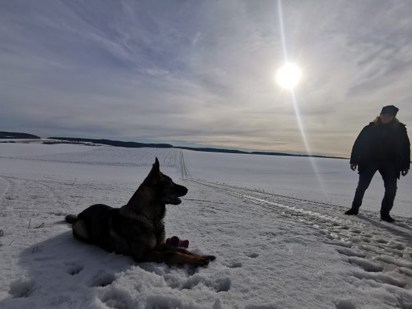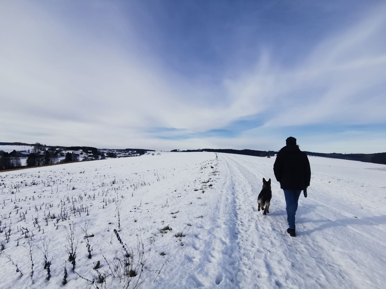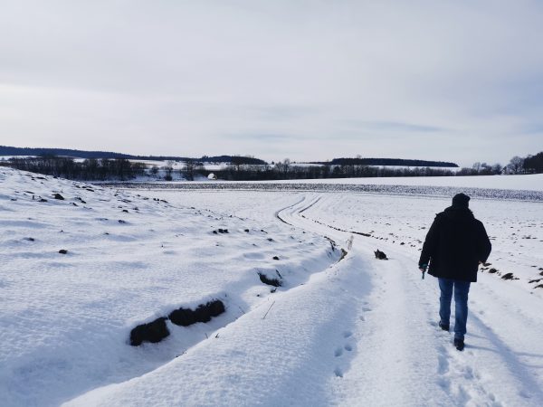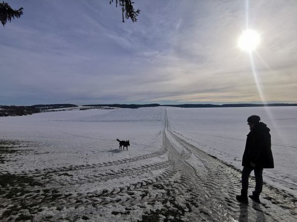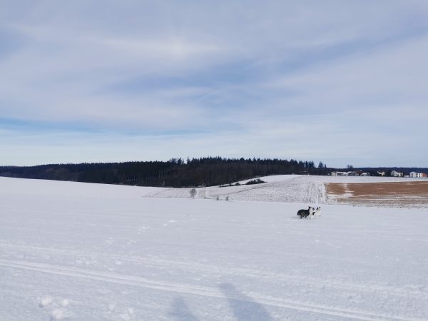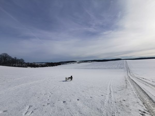 Die Gegend ist insgesamt ziemlich hügelig, deswegen geht’s immer auf und ab. Auf dem ganzen Weg sind wir keinem anderen Hund (oder Spaziergänger) begegnet. Einige Male haben wir aber in Entfernung Rehe gesehen.