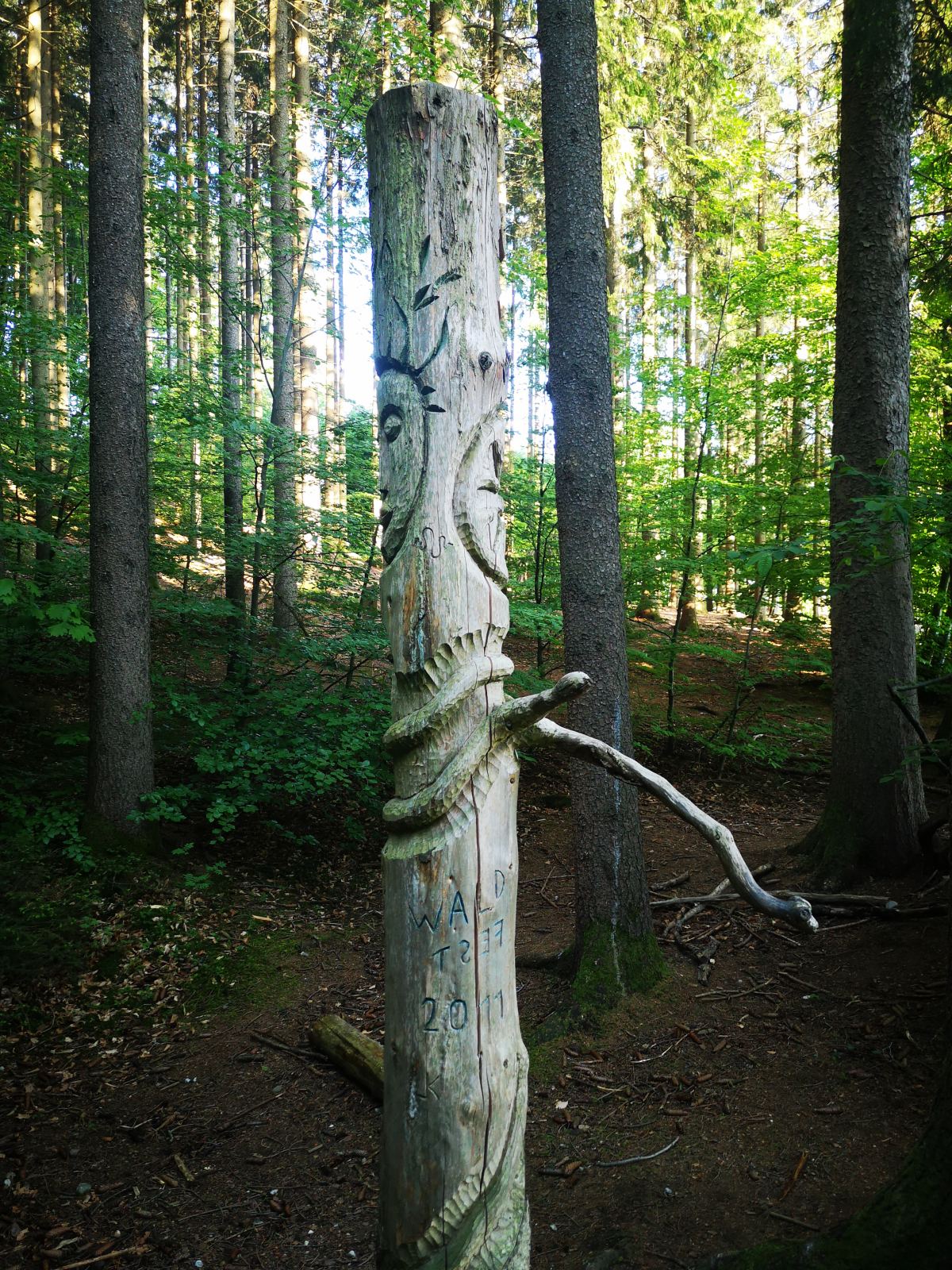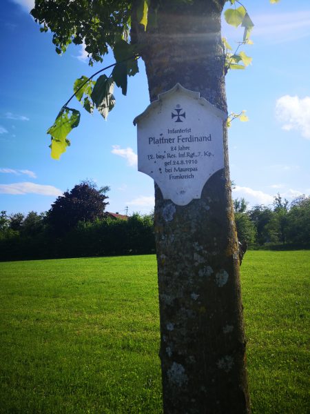 Wir starten am Parkplatz des Aussichtsturms. Von dort aus geht es ein Stück die Straße zurück, dann über einen asphaltierten Weg Richtung Egglburger See. An den Bäumen entlang der Strecke sind Tafel befestigt, die an die im ersten Weltkrieg gefallenen Ebersberger erinnern.