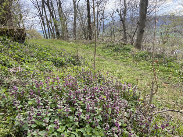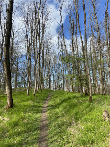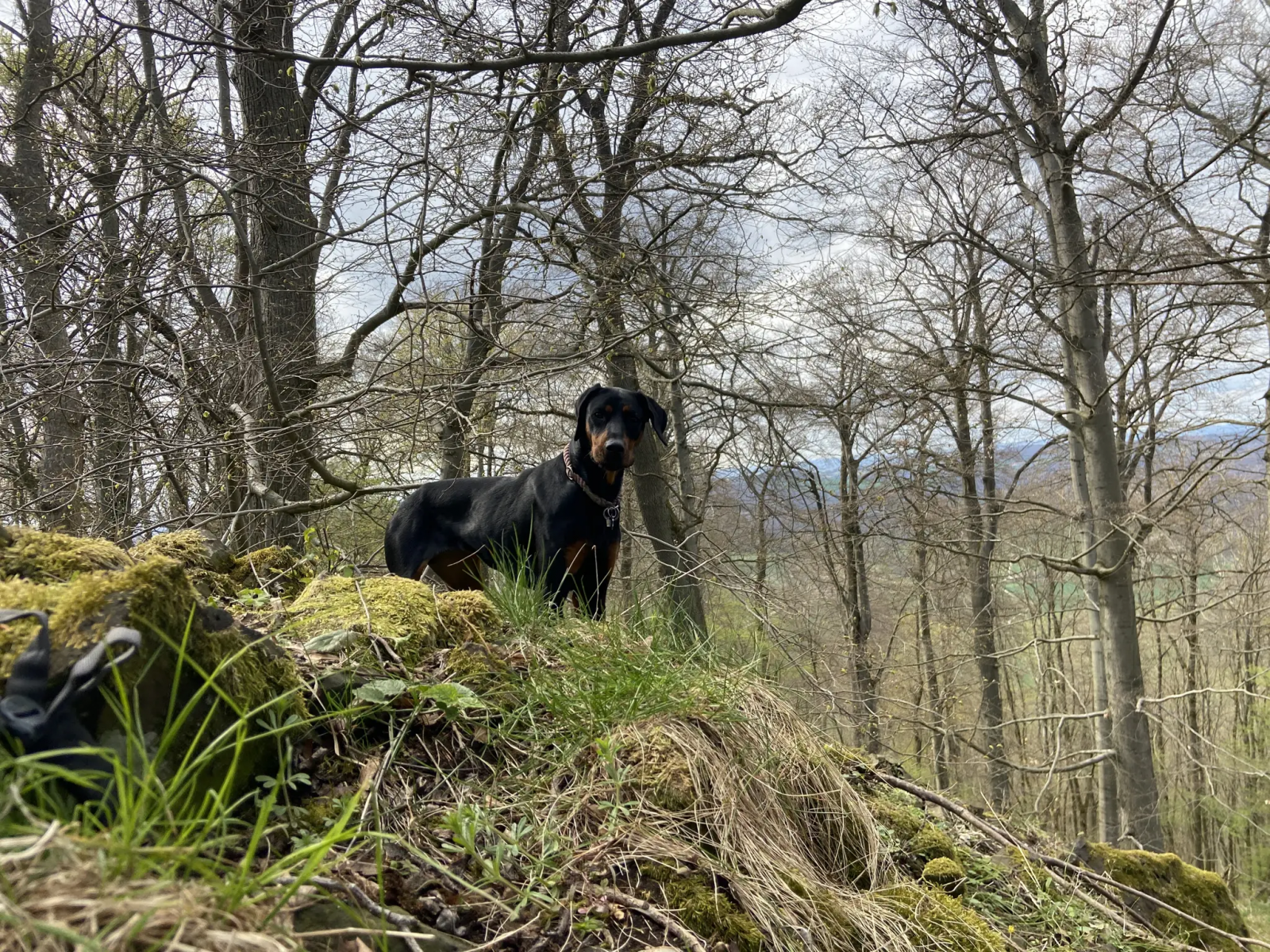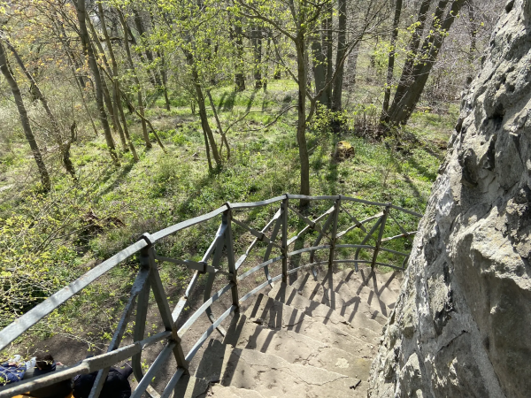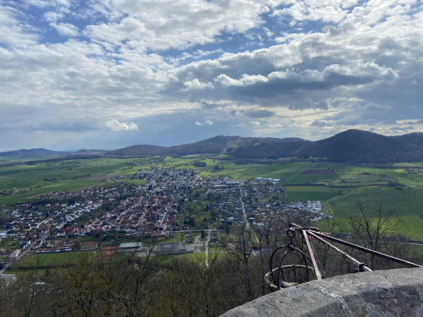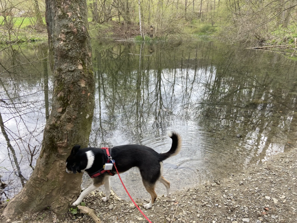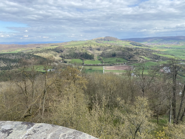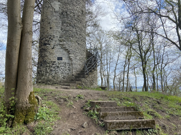 Die Strecke führt am Frankenteich vorbei, hier steht auch ein altes Wasserhäuschen. Dann geht es über Wiesen und Waldwege bergauf zum Schreckenberg-Turm. Der Aufstieg im Turm ist nichts für Hunde – enge, dunkle Metall- und Holzstiegen. Menschen, die dort hochklettern, werden aber mit einem phantastischen Ausblick zum hohen Dörnberg und in das ganze Umland belohnt.