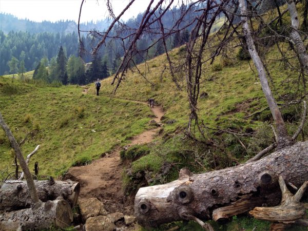 Vom Parkplatz kommend, überqueren wir Straße und folgen der Beschilderung Hintermoar Alm / Kranzhorn / Kranzhornalm auf einem Almweg zwischen Weiden bergauf. Wir laufen weiter auf dem Almweg, den wir jedoch bald schon über viele schöne (unbeschilderte) Steige abkürzen. Immer wieder stoßen wir auf den Almweg mit Wegweisern Richtung Kranzhorn, die uns versichern: Wir sind auf dem richtigen Weg.