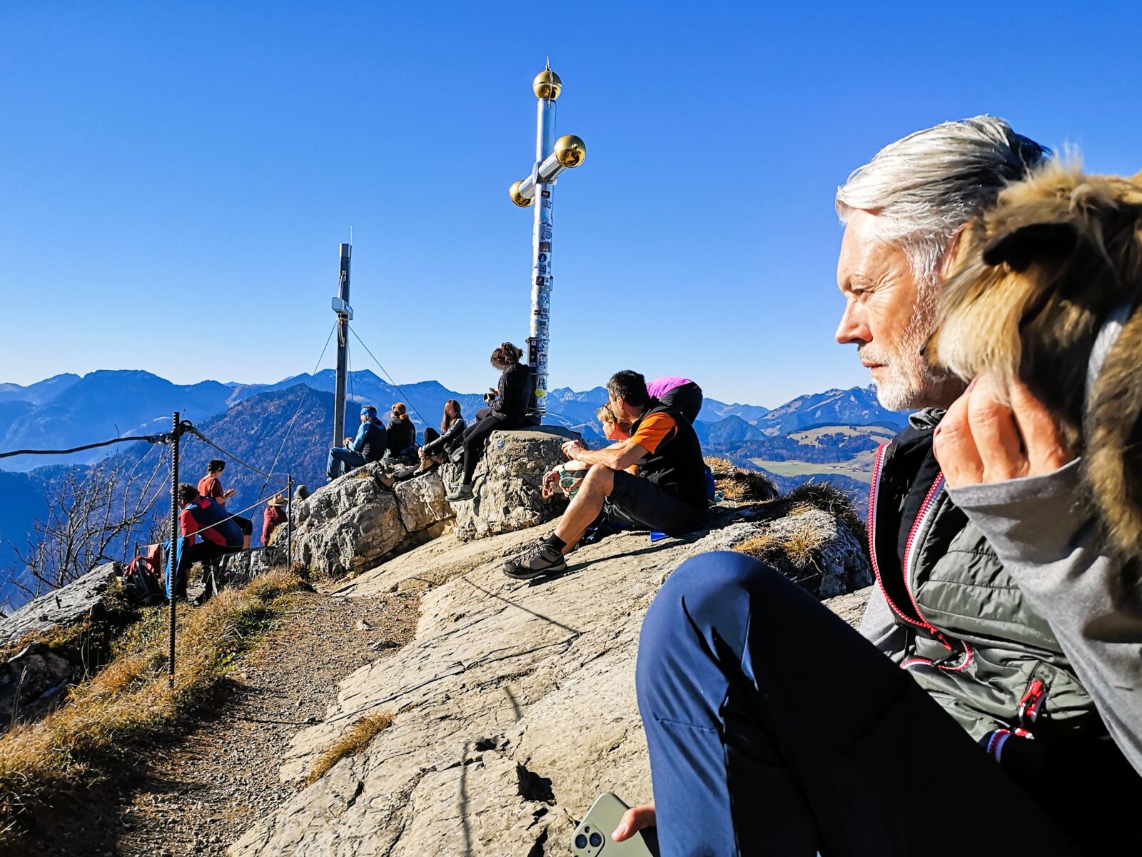 Ein Gipfel, aber zwei Gipfelkreuze: Die deutsch-österreichische Grenze verläuft genau über den luftigen Gipfelaufbau des Kranzhorns (1.367 m) mit seinen steil abfallenden Flanken. Viel Platz bleibt hier oben nicht – aber es reicht doch für zwei sehr unterschiedliche Gipfelkreuze, die die Ländergrenze markieren. Eine Ausnahmeerscheinung, die wir so noch nie zuvor gesehen haben. Doch selbst wenn man kein Fan von Gipfelkreuzen ist, bietet das Kranzhorn einen weiteren guten Grund, hinaufzusteigen: der großartige Tiefblick über das Inntal und hinauf auf den Zahmen und den Wilden Kaiser. Bei guter Sicht schaut man auf die Hohen Tauern. Und der Heuberg sieht aus nächster Nähe auch sehr imposant aus. Eine weitere Kuriosität am Berg: unterhalb des Gipfels liegt eine Kapelle. Deren Tür liegt noch in Bayern, der Altar schon in Österreich. 😍🐶