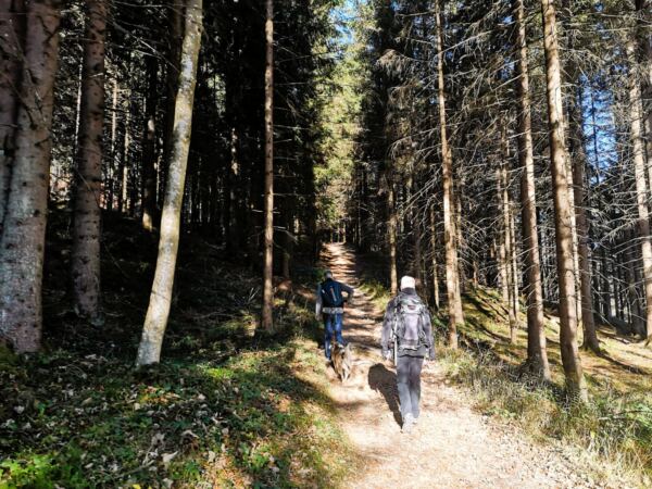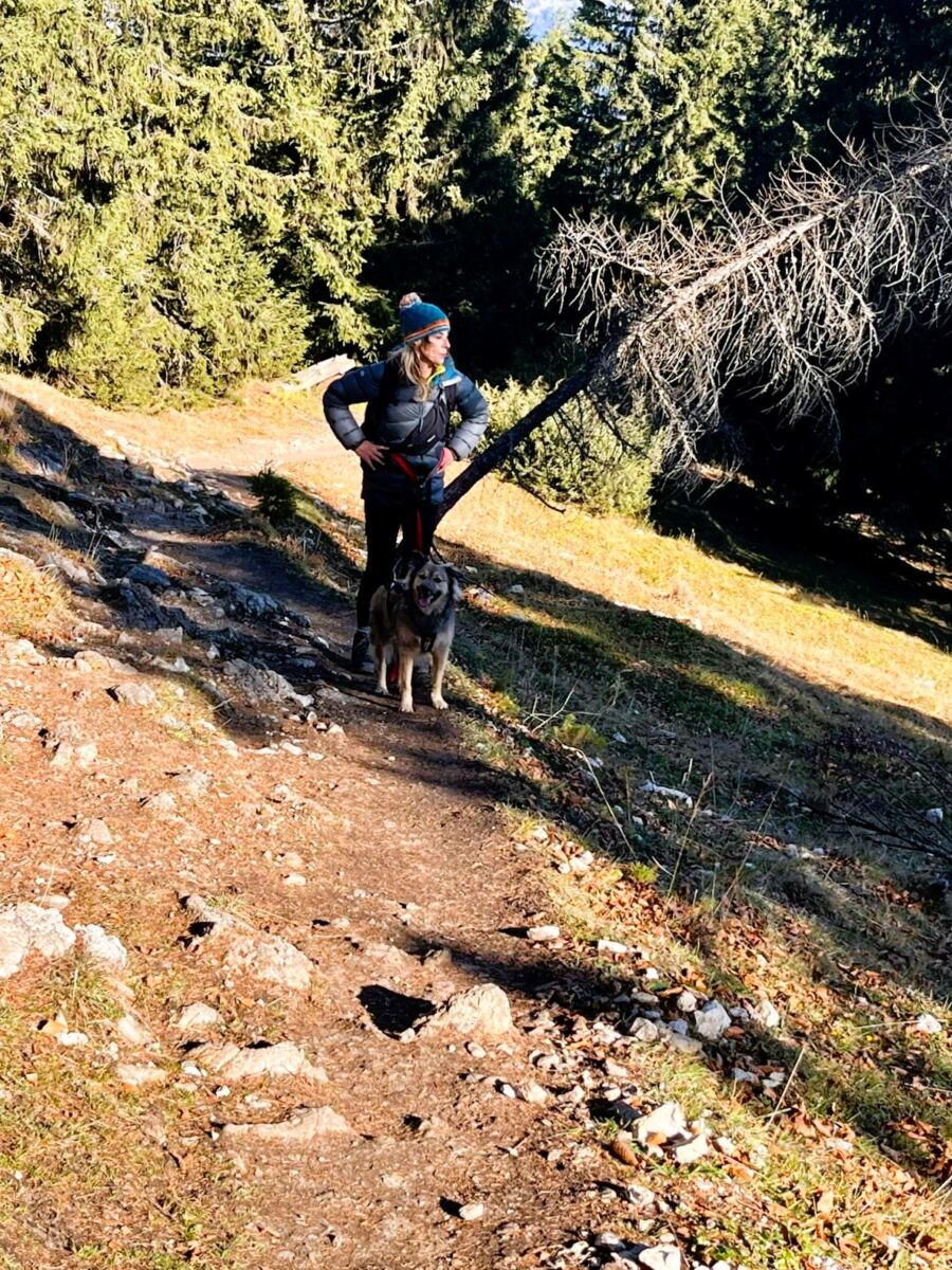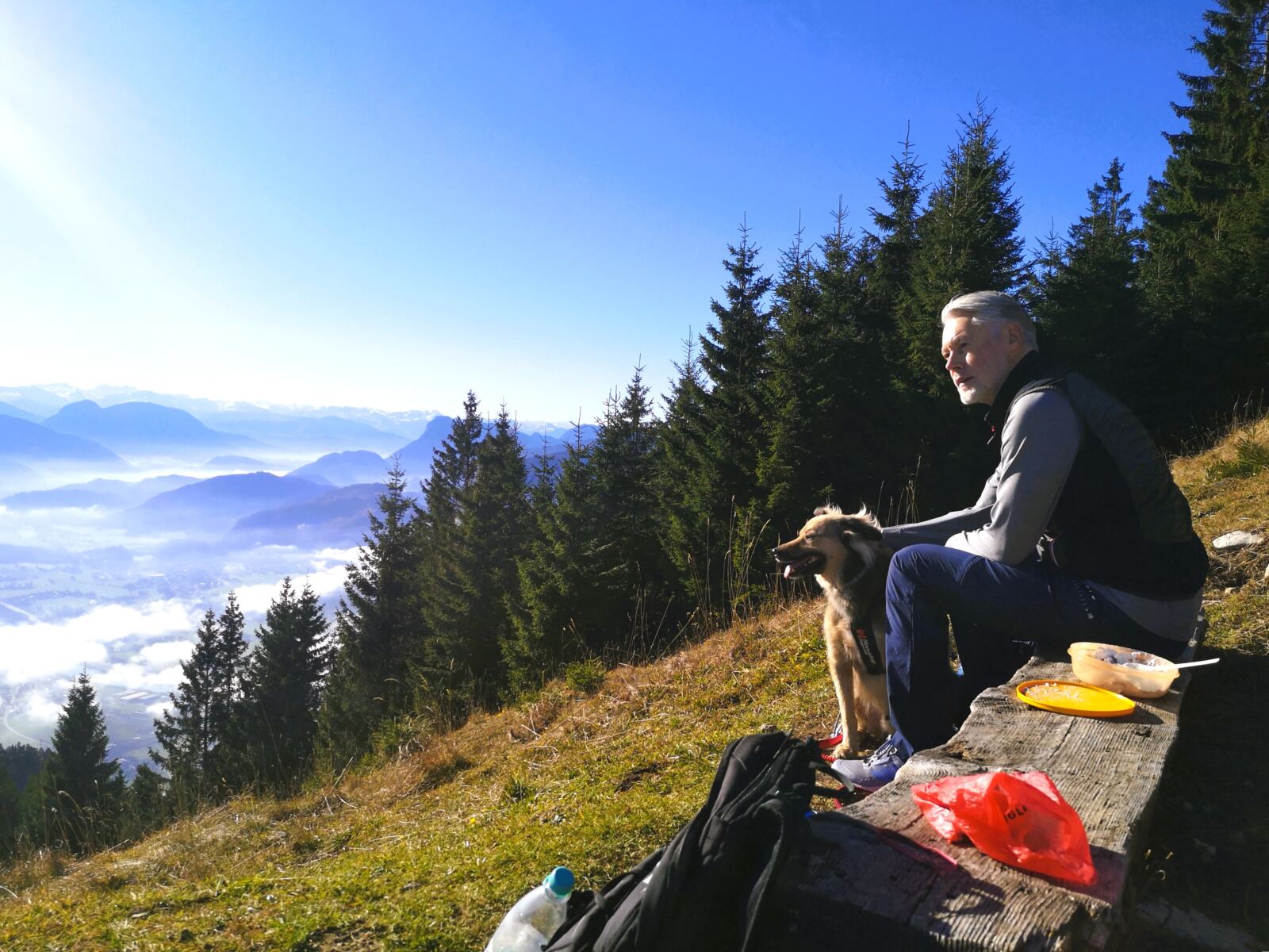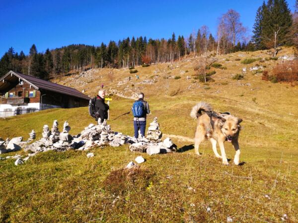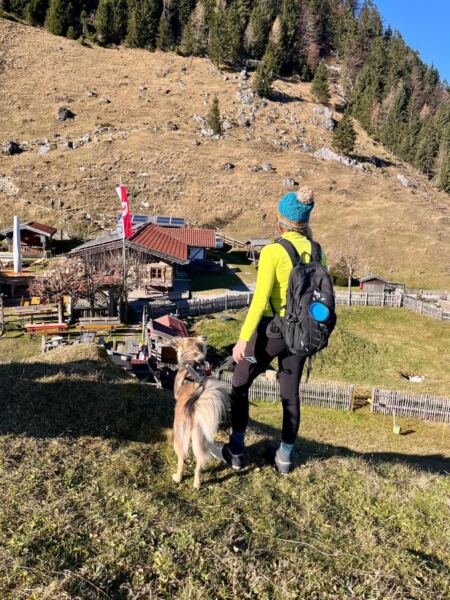 Hier heißt es nun achtsam sein und den Hund dicht bei sich halten. Nach einer ausgiebigen Pause mit großartigem Weit- und Tiefblick laufen wir zurück zur Kranzhornalm. Hier gönnen wir uns eine Einkehr. Die Käspatzn sehen einfach zu gut aus – und schmecken auch so. 😋