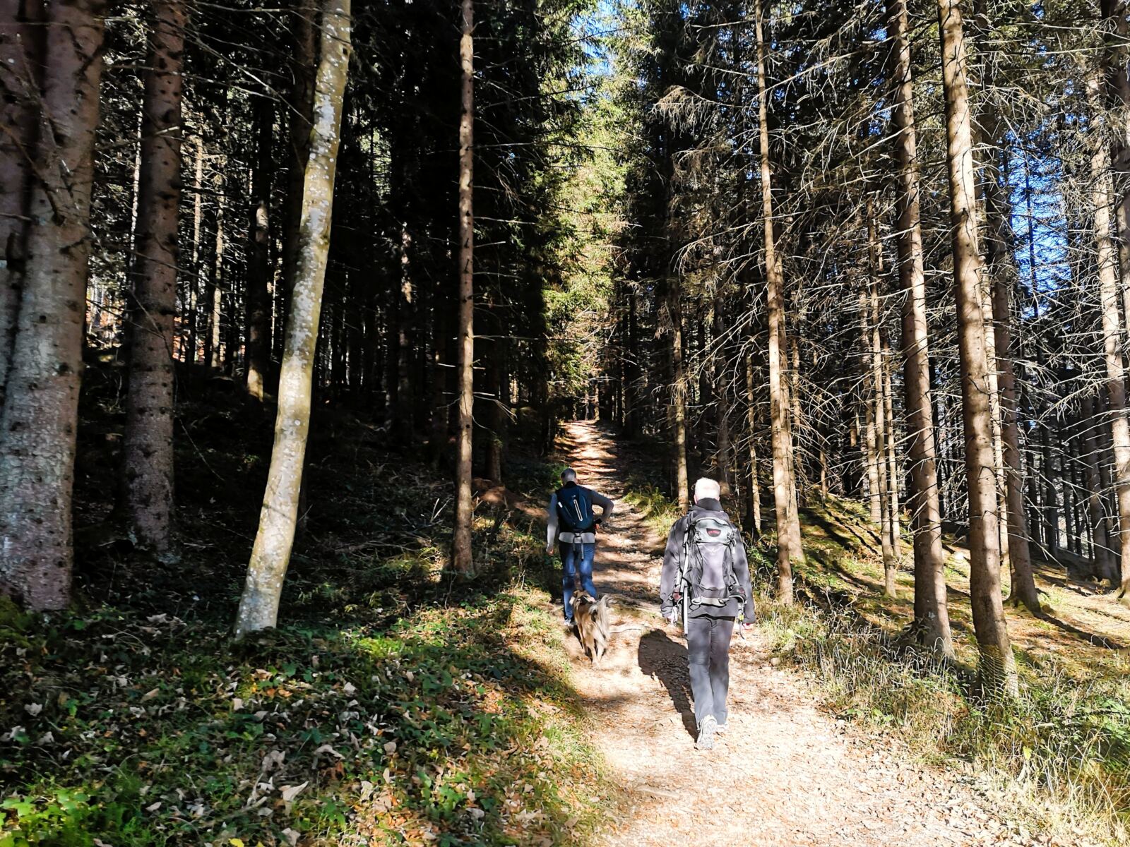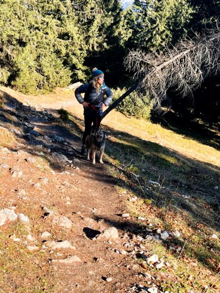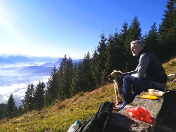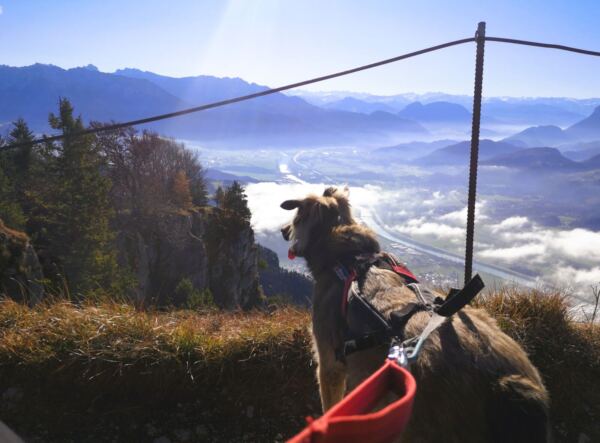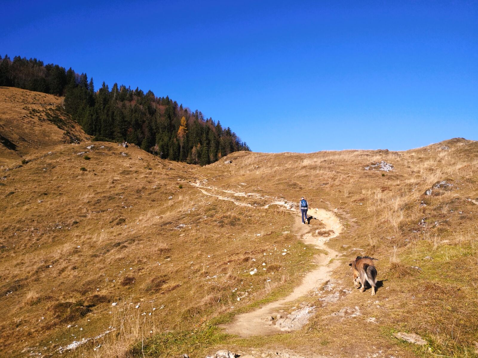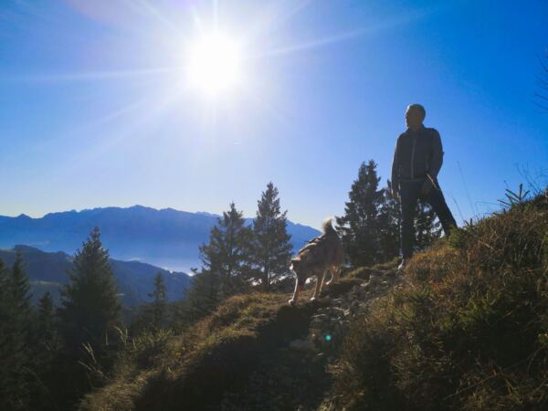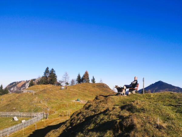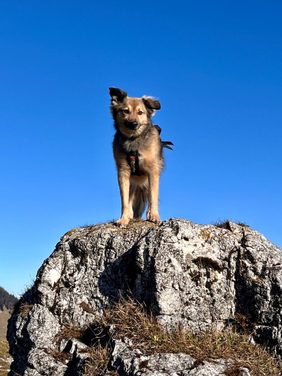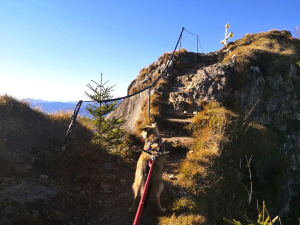 Diese Wanderung ist auch bei Menschen mit Hund sehr beliebt. Wir kommen mit unseren Vierbeinern am liebsten außerhalb der Weidesaison hierher. Denn unterwegs passieren wir einige Viehweiden, auch solche mit Mutterkühen. Wenn die Kühe schon unten im Tal sind, ist`s hier oben deutlich entspannter. An sonnigen Wochenenden empfiehlt es sich gerade mit Hund, früh zu starten. Denn der eigentliche Gipfel bietet nur wenig Fläche und ist nur über einen sehr schmalen Weg zu erreichen. Das erfordert Rücksicht auf andere Gipfelstürmer*innen, die Angst vor Hunden haben. Die wenigen Schritte auf den Gipfel verlangen ein wenig Schwindelfreiheit. 🐕🦺 Weil’s hier an allen Seiten senkrecht abwärts geht, sollte man seinen Hund auf dem Gipfel außerdem eng bei sich halten. Der Rest des Wegs ist mit einer guten Grundkondition und festen Schuhen für die Zweibeiner problemlos zu meistern.