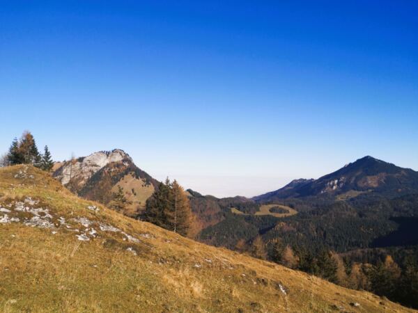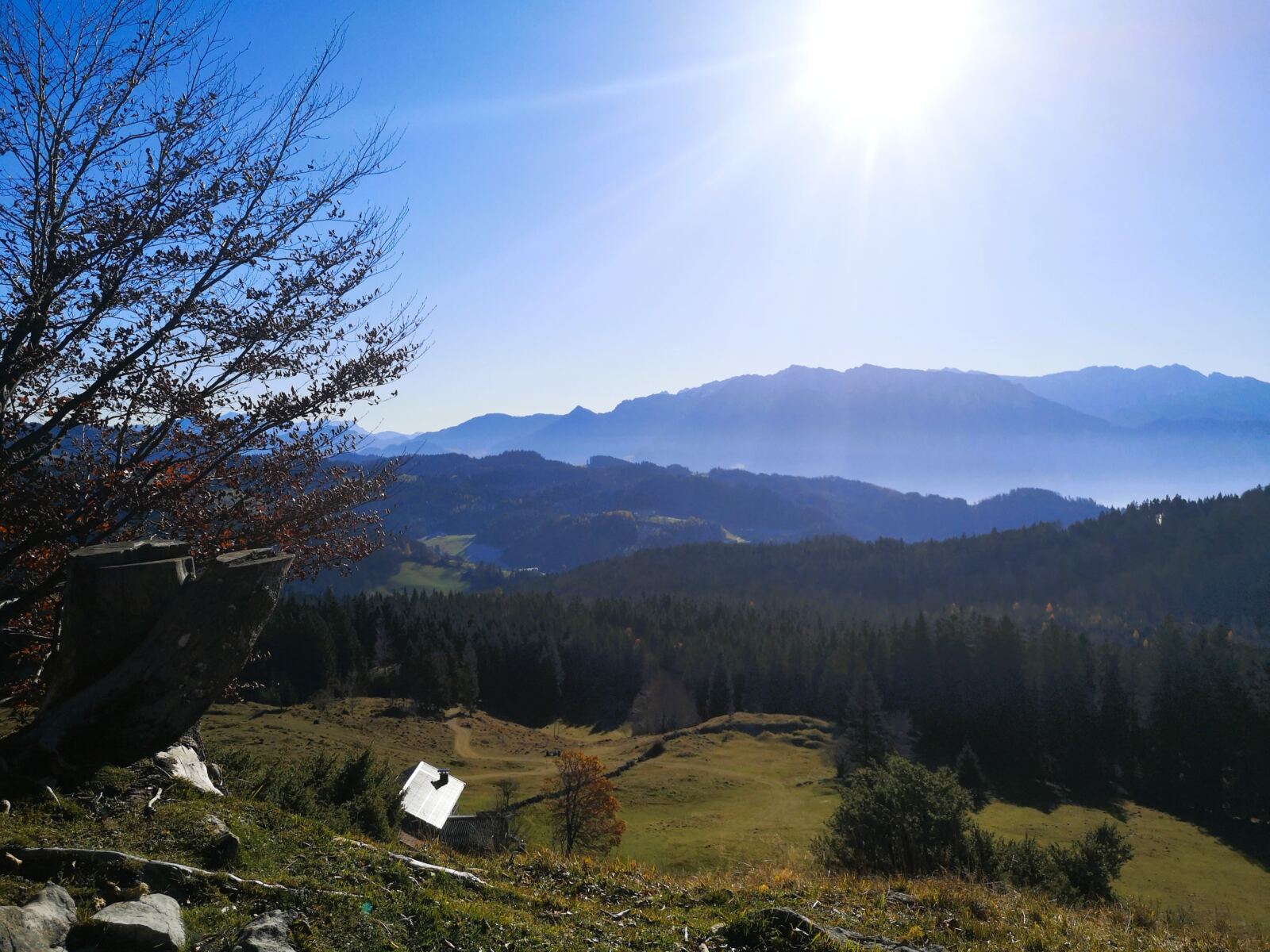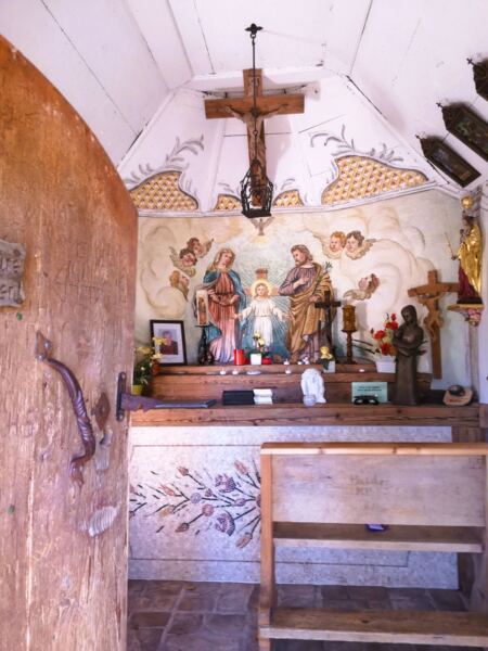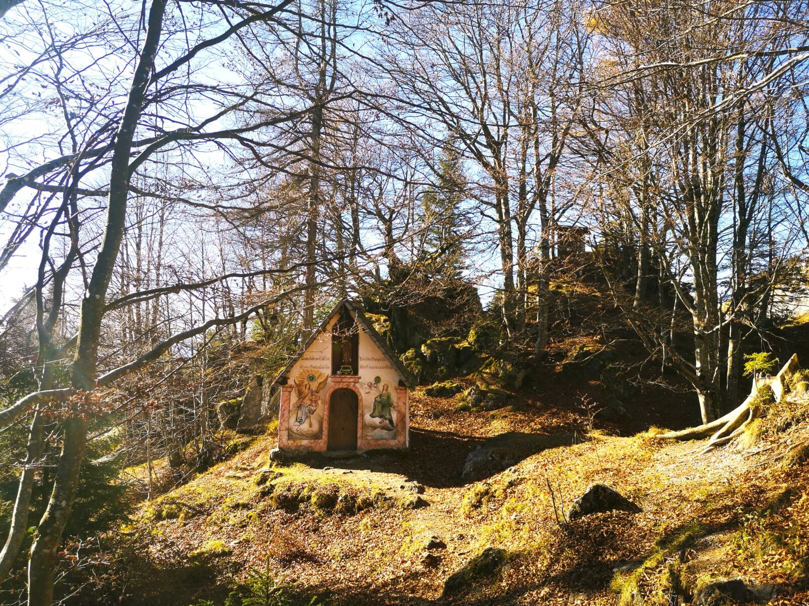 Vorbei an der Alm folgen wir dem Bergsteig weiter bergauf Richtung Gipfel, jetzt schon mit wunderschönem Tiefblick. Nach einem recht knackigen Anstieg erreichen wir die Kapelle (hineinschauen lohnt sich). Dann sind es nur noch wenige Meter hinauf zum Gipfel, der als vorgeschobene Aussichtskanzel am Berg klebt.
