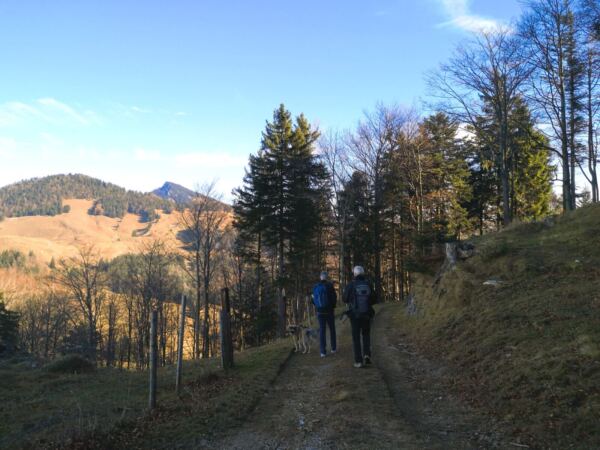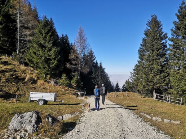 Wir verlassen die Kranzhornalm und folgen der breiten steinigen Almstraße, rechts von uns der Heuberg, bergab. Bald erreichen wir eine breite Weggabelung. Hier halten wir uns rechts. Der Weg führt uns durch den Wald um den Berg herum, bald wieder mit Sonne im Gesicht. Schließlich stoßen wir auf das Viehgatter über der Bubenaualm, das wir schon vom Hinweg kennen.