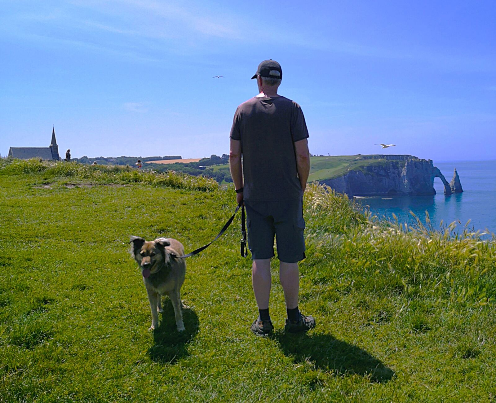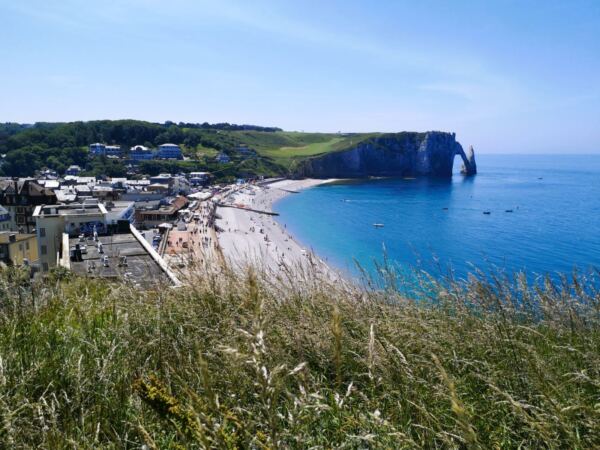 Schließlich erreichen wir den Aussichtspunkt über Étretat. Der Blick auf den langen Kiesstrand, die malerische Altstadt und die gegenüberliegenden Falaises d’Aval mit dem markanten Porte d’Aval – dem „Elefantenrüssel“ – ist atemberaubend. Links über uns thront die kleine Kapelle Notre-Dame de la Garde, einst Seefahrern gewidmet.