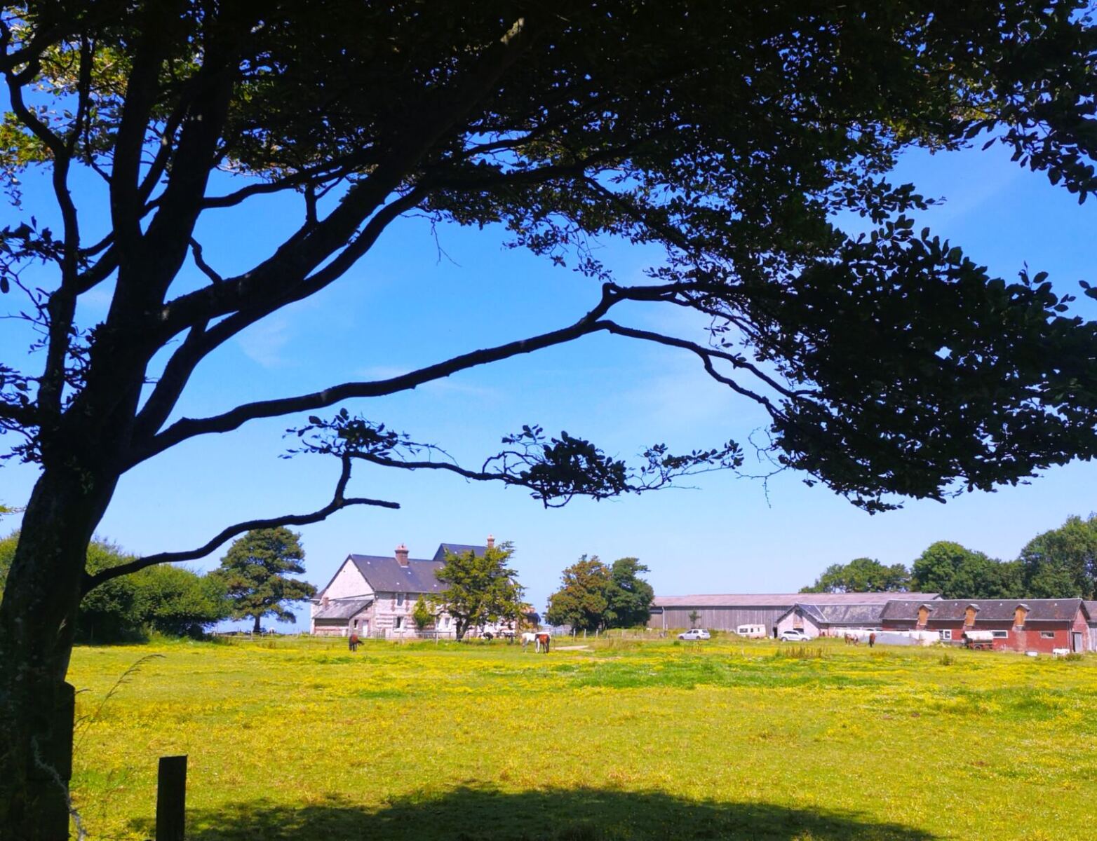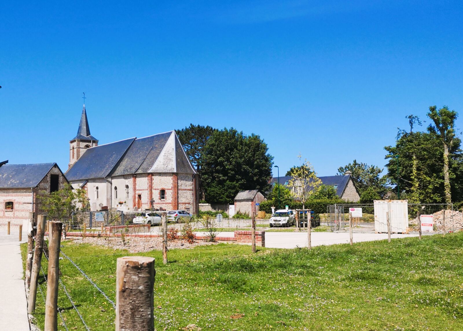 🗺️Unsere Rundwanderung beginnt am Parkplatz bei der Kirche in Bénouville, einem Dorf wenige Kilometer oberhalb von Étretat. Vor der Kirche halten wir uns rechts und folgen für ein kurzes Stück dem schmalen Teerweg Rue des Terriens, bevor wir bald links abbiegen auf den Chemin de la Valleuse du Curé. Dieser geht über in einen Wirtschaftsweg. Er  bringt uns durch offene Felder langsam hinunter Richtung Meer.