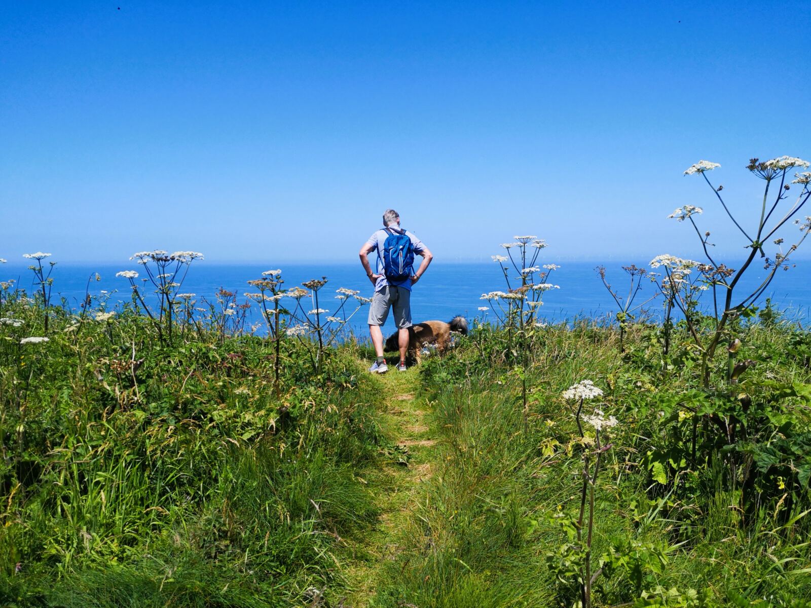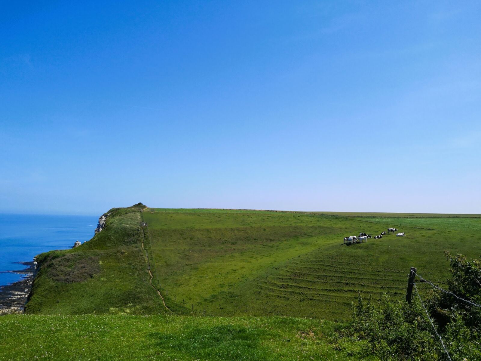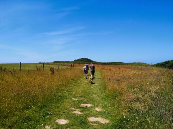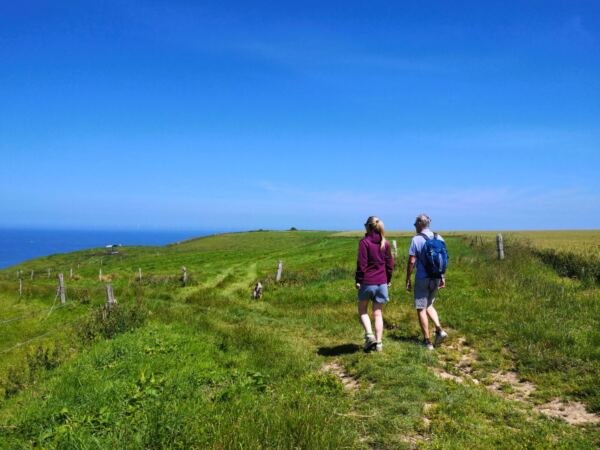 Jetzt beginnt der spektakuläre Teil der Wanderung: Über schmale Wiesenpfade laufen wir entlang der Klippenkante. Links liegen Weiden mit normannischen Rindern 🐄, rechts fällt das Gelände steil zur Küste hin ab. Insekten summen in den Wildblumen, Möwen kreischen über unseren Köpfen.