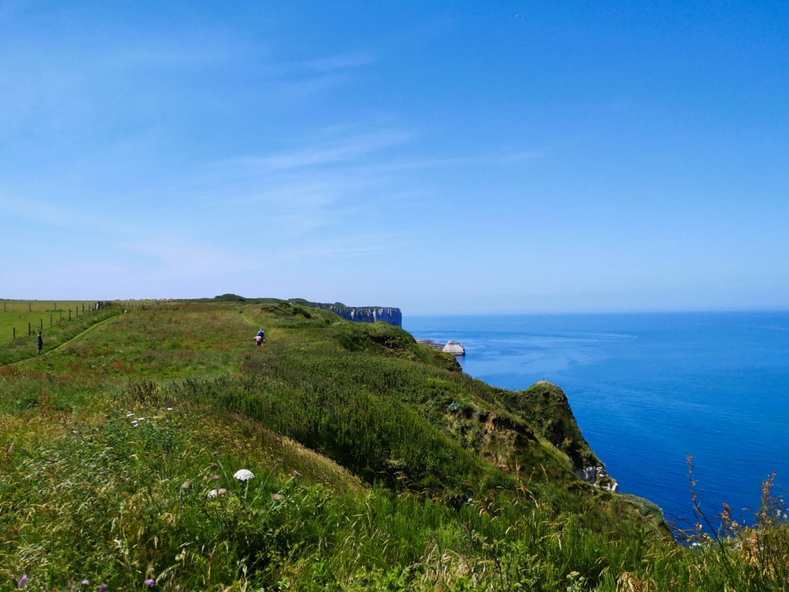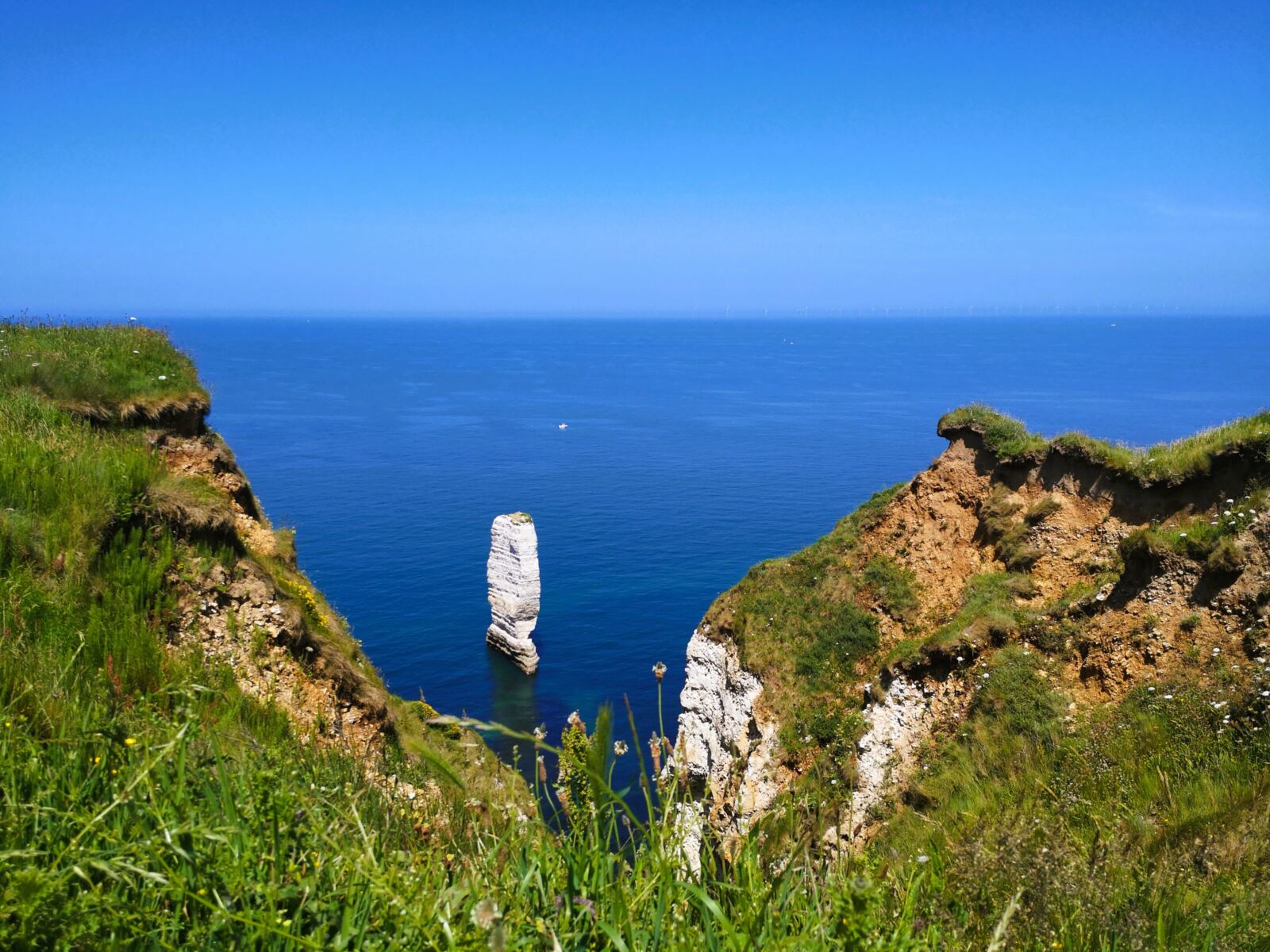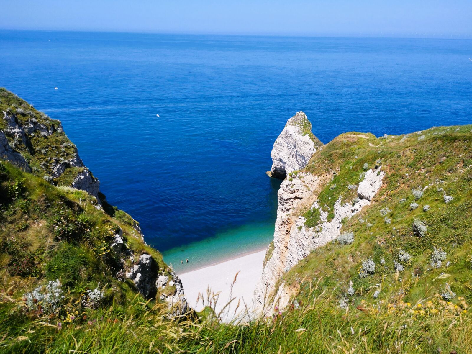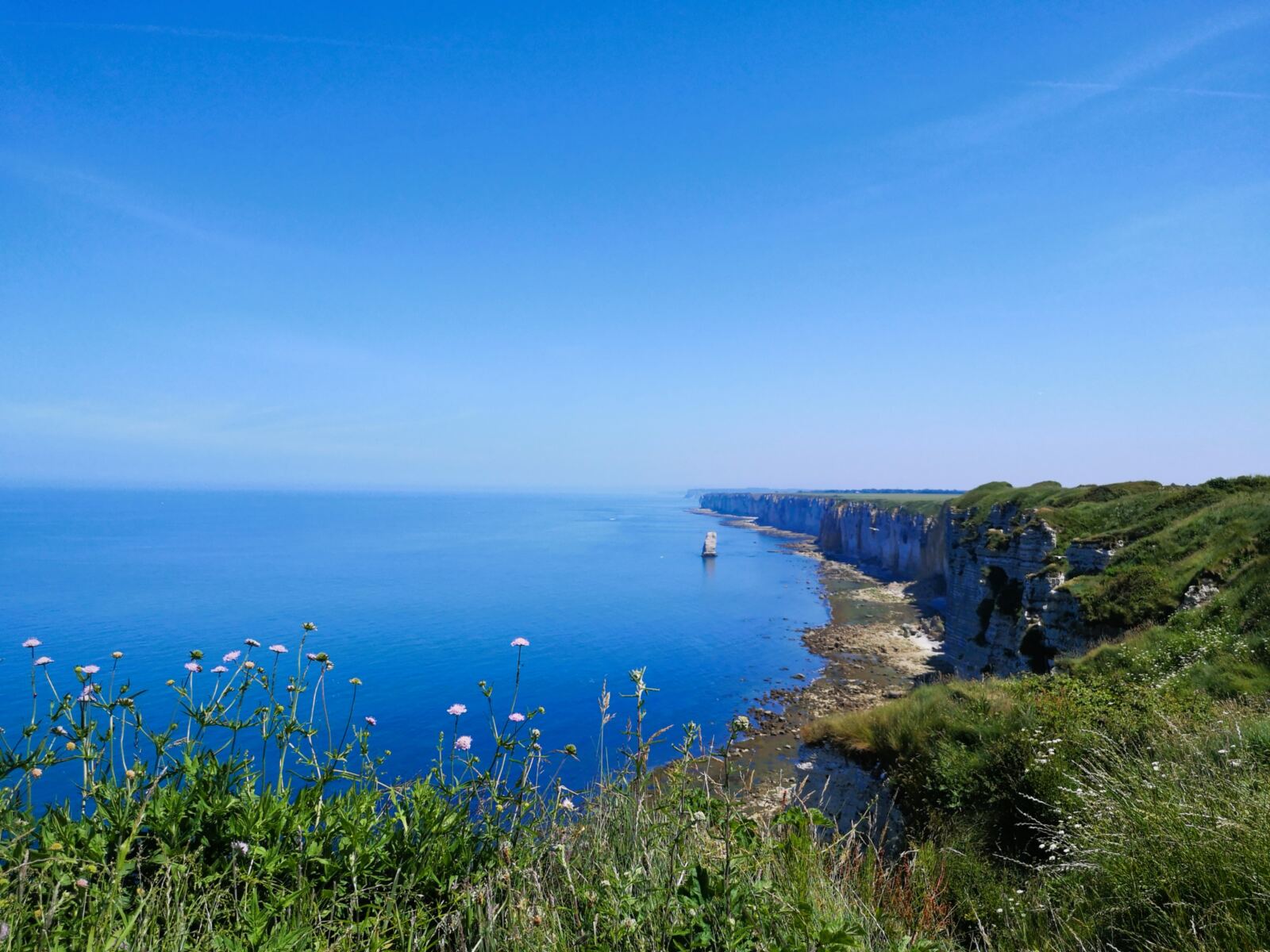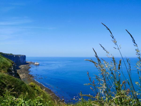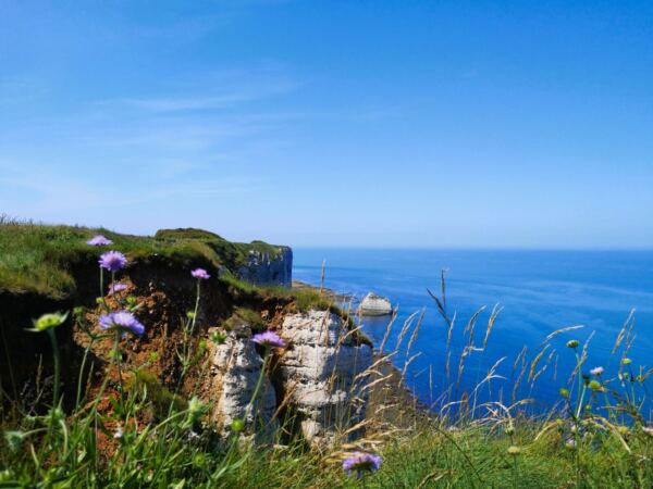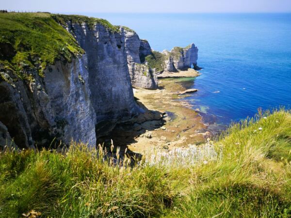 Wir passieren die auffällige Felsnadel von Belval, die wie eine weiße Lanze aus dem Meer ragt. Das Gestein der Alabasterküste besteht aus kalkhaltiger Kreide, durchsetzt mit Feuerstein – geologisch etwa 90 Millionen Jahre alt. Hier ist die Normandie dramatisch schön.