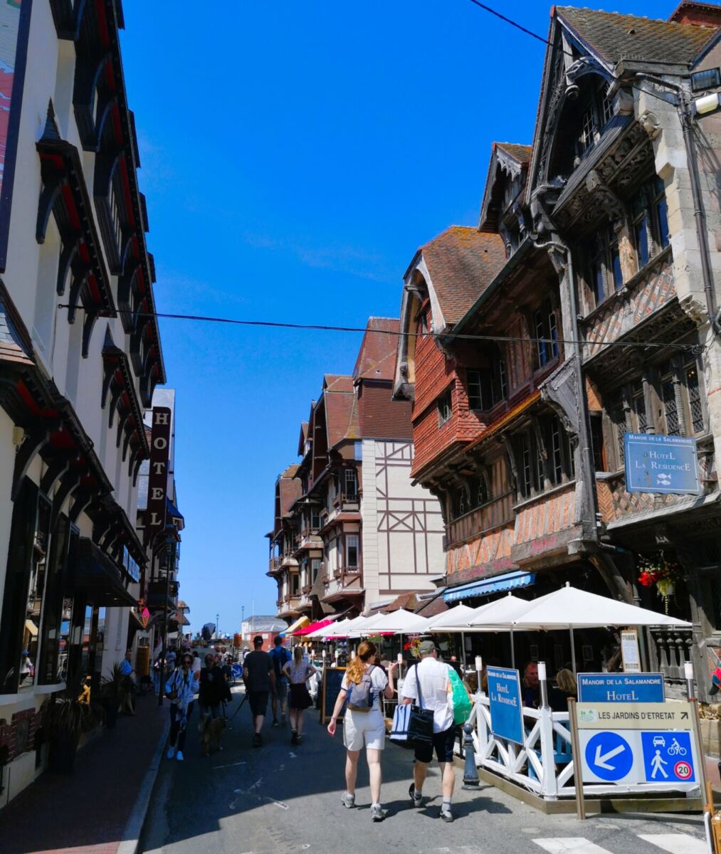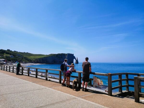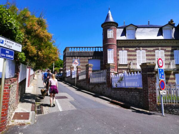 ☕Von hier steigen wir über ca. 100 Stufen hinab zur Strandpromenade von Étretat. Hunde sind am zentralen Strand leider nicht erlaubt, aber die Altstadt ist charmant und lädt zu einer kurzen Runde oder einer Pause auf einer Caféterrasse ein.