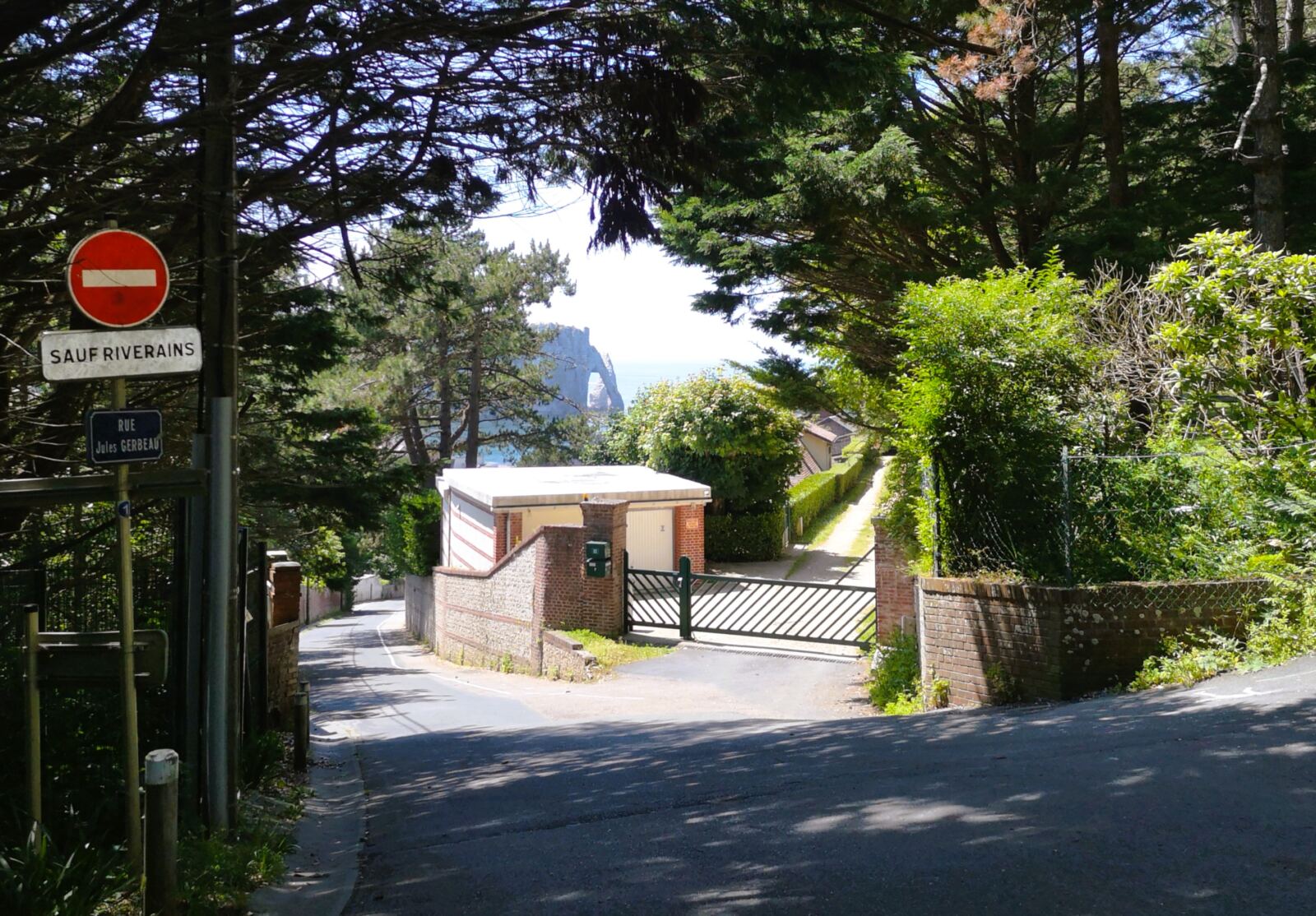 Für den Rückweg folgen wir der Promenade bis zum Fuß des Klippenaufstiegs, biegen dort aber scharf rechts auf den ausgeschilderten Wanderweg ab. An der nächsten Kreuzung geht es links auf die Rue Jules Gerbeau. Nun heißt es: bergauf! Zunächst zwischen Häusern, dann auf dem Chemin Côté du Mont. Hinter einer Seniorenresidenz wird die Straße zum Feldweg. Bald erreichen wir wieder die Höhe.