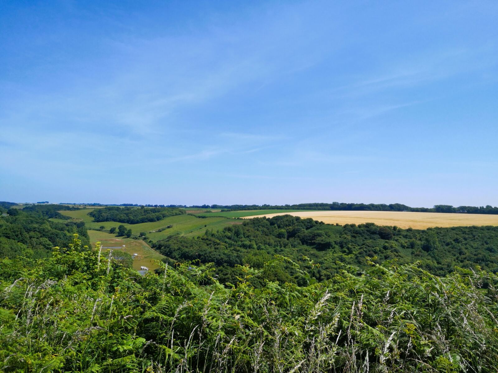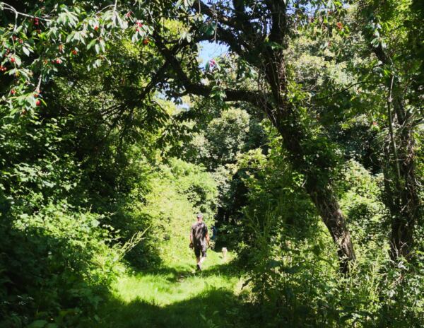 Bei nächster Gelegenheit biegen wir rechts ab auf einen unmarkierten, aber gut sichtbaren Wiesenpfad, der uns bergab und durch ein kleines, angenehm schattiges Waldstück führt 🌳. Der Weg schwenkt nach links und mündet in einen breiteren Feldweg, dem wir rechts folgen. Parallel zum Hinweg laufen wir nun in sanftem Auf und Ab zurück Richtung Bénouville.
