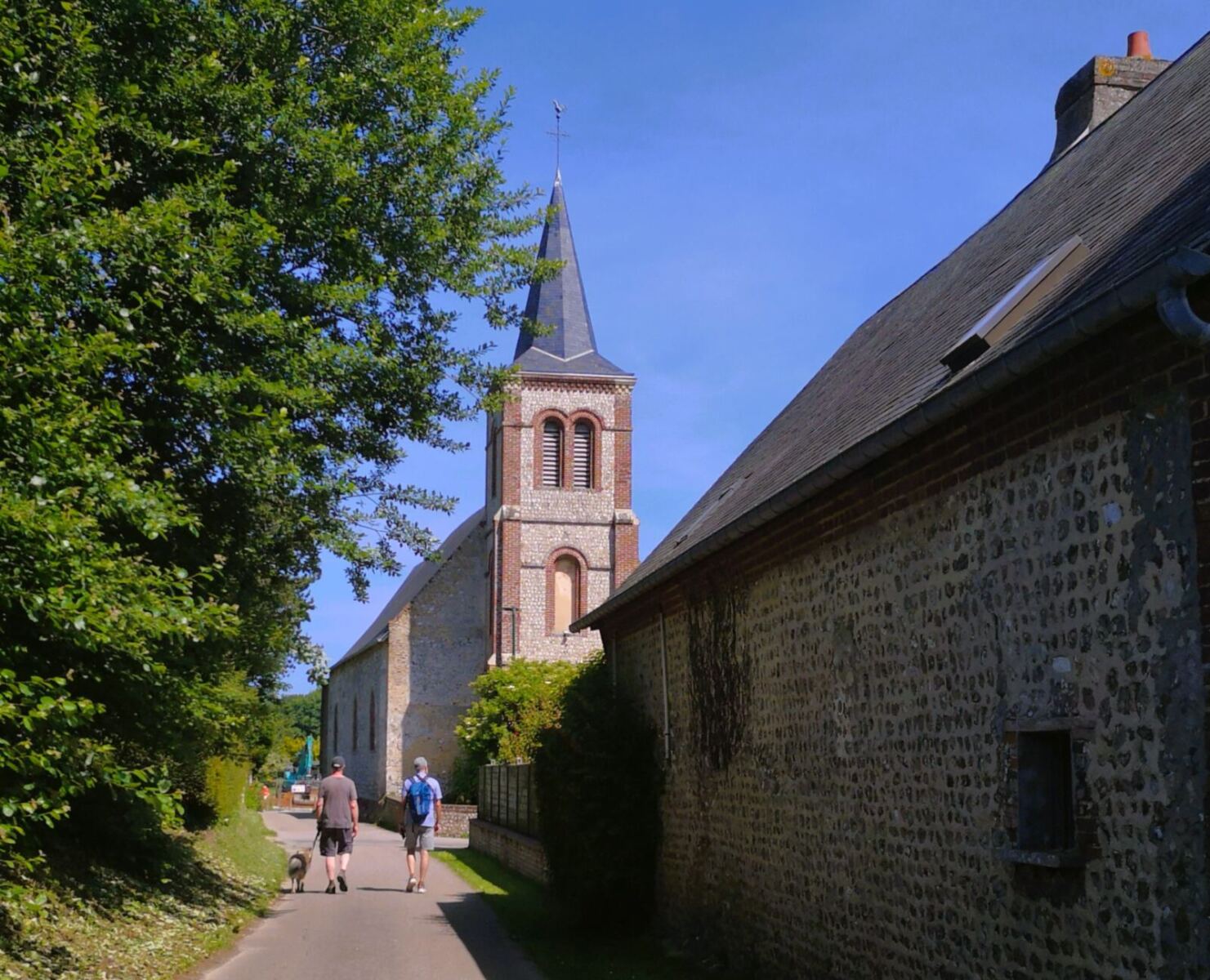 Der Weg führt uns schließlich auf die kleine Straße Chemin du Milieu, dann in die Rue du Hameau du But de Ville. Über die Hauptstraße erreichen wir bald wieder unseren Ausgangspunkt bei der Kirche von Bénouville.