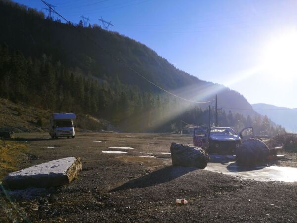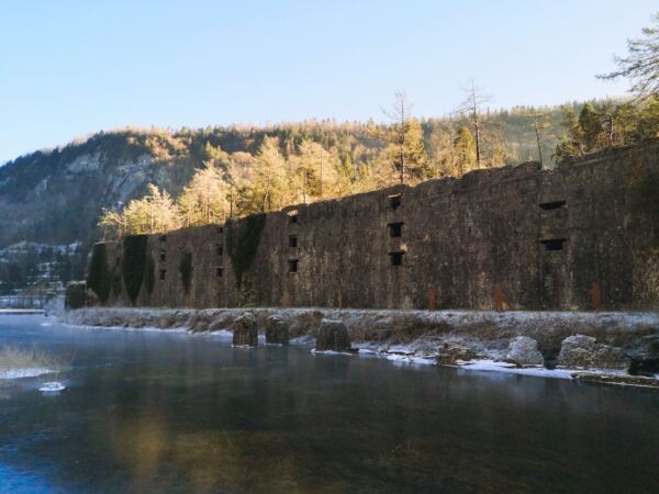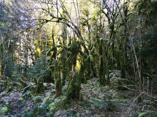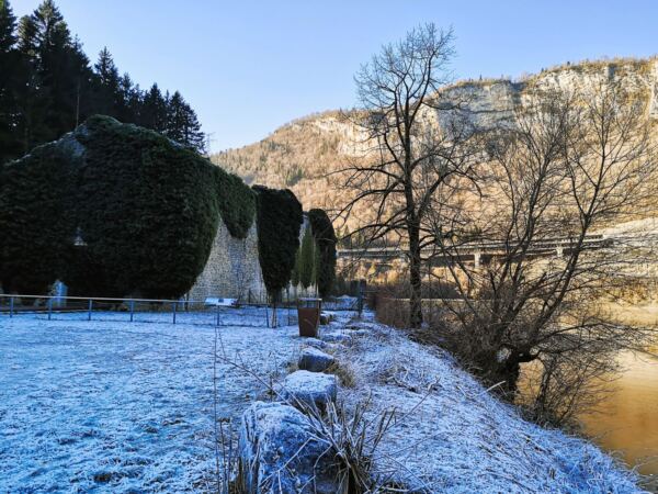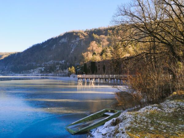 Den See beschatten hohe, steil aufragende Hänge. So liegt sein Wasser fast immer im Schatten. Wegen der feuchten Kälte hier unten im Talgrund tragen die Bäume am See lange Moosbärte und dicke Moosmäntel. Von November bis tief hinein in den März friert der See meist zu. Ein Unternehmer aus der der Nähe machte sich das zunutze. 1865 – also lange bevor Kühlschränke erfunden wurden – gründete er die Eiswerke von Sylans. Zusammen mit seinen Leuten erntete er im Winter Natureis aus dem See, lagerte es ein und schickte es an Abnehmer, die damit kühlten. Bald bekam das Werk einen Eisenbahnanschluss. Gut 300.000 Tonnen Eis im Jahr ging nun nach Paris, ein Teil davon sogar bis Algerien. Die Société des Glacières de Paris kaufte 1885 die Eiswerke und expandierte. Sie baute am Ufer ein 150 m langes und 12 m hohes Firmengebäude aus gemauertem Stein, dessen Ruine heute noch steht. Infotafeln an den Resten von Lagerhäusern und Unterkünften erzählen davon, wie mühevoll und findig die Menschen am Lac de Sylans Eis ernteten – bis der Kühlschrank kam und das Geschäft 1917 starb. Wir fanden es superspannend.