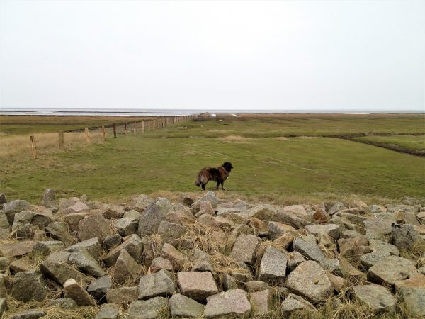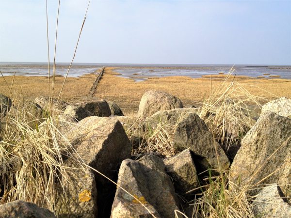 Typisch für Friedrichskoog Spitze: Basaltblöcke als Wellenbrecher, dahinter Salzwiesen und das Meer.