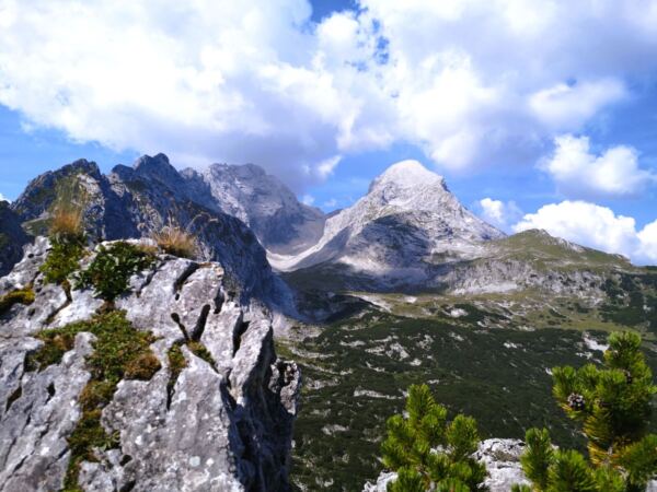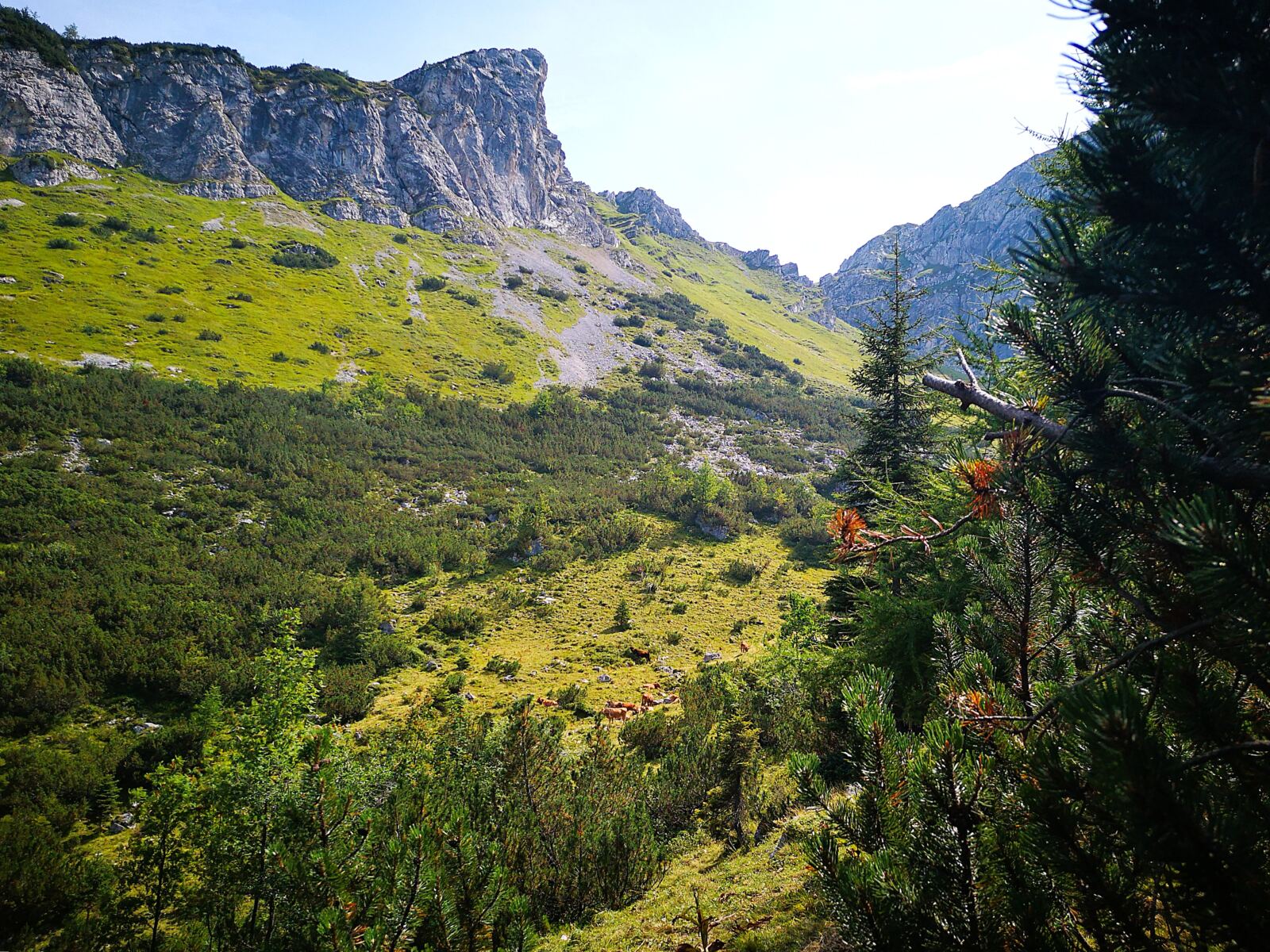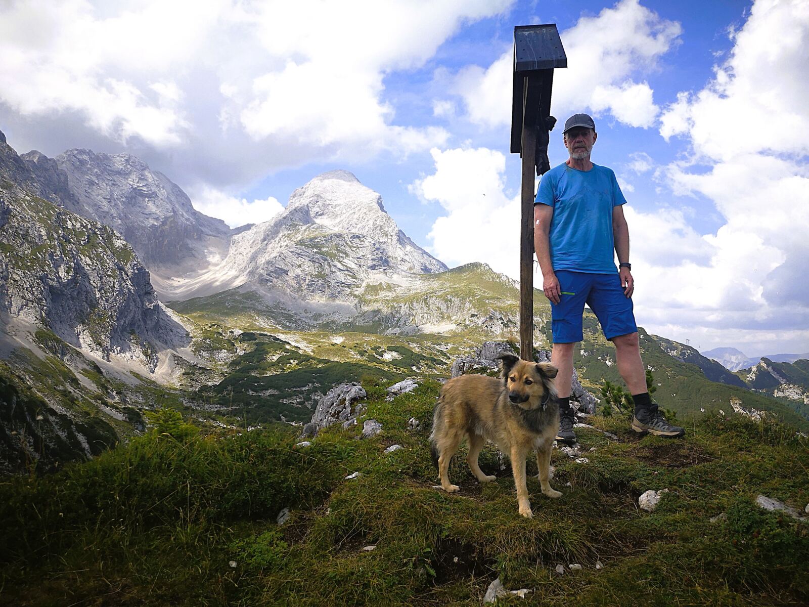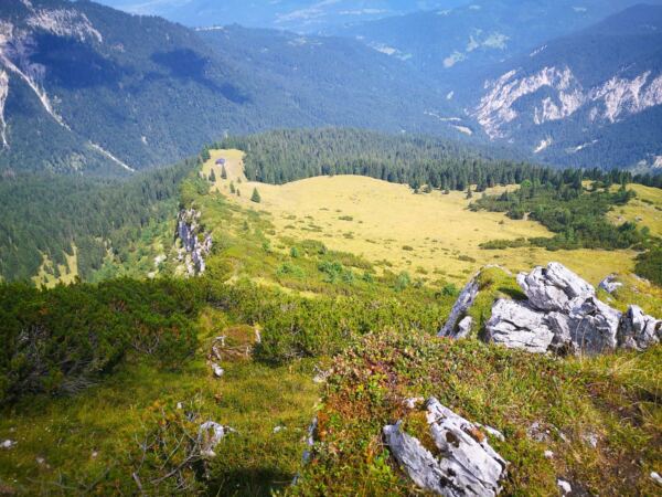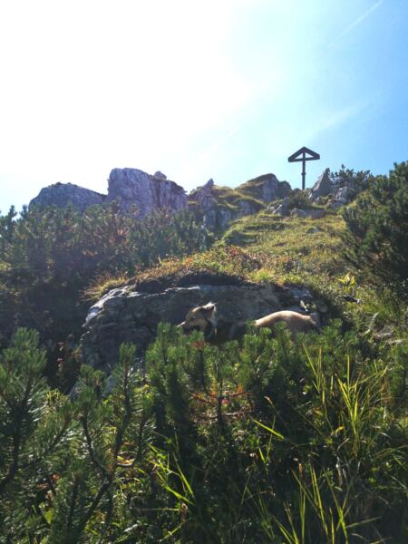 Auf der Almwiese weiden Jungbullen, denen wir nicht näherkommen möchten. Stattdessen wählen wir die direkte Linie bergauf, rechts an der Hütte vorbei zur Stuibnspitze mit ihrem Gipfelkreuz, dem ersten der beiden Gipfel. Hier und da treffen wir auf Steigspuren. Meist geht es weglos nach oben und das ziemlich steil. An diesem warmen Tag legen wir mit Rücksicht auf unseren Amos unterwegs zwei Pausen unter Latschen ein. Über eine kurze felsige Rinne erreichen wir das Gipfelkreuz. Unseren Hund halten wir eng bei uns, denn direkt unter dem Kreuz fällt die Schnauze der Stuibnspitze steil ab.