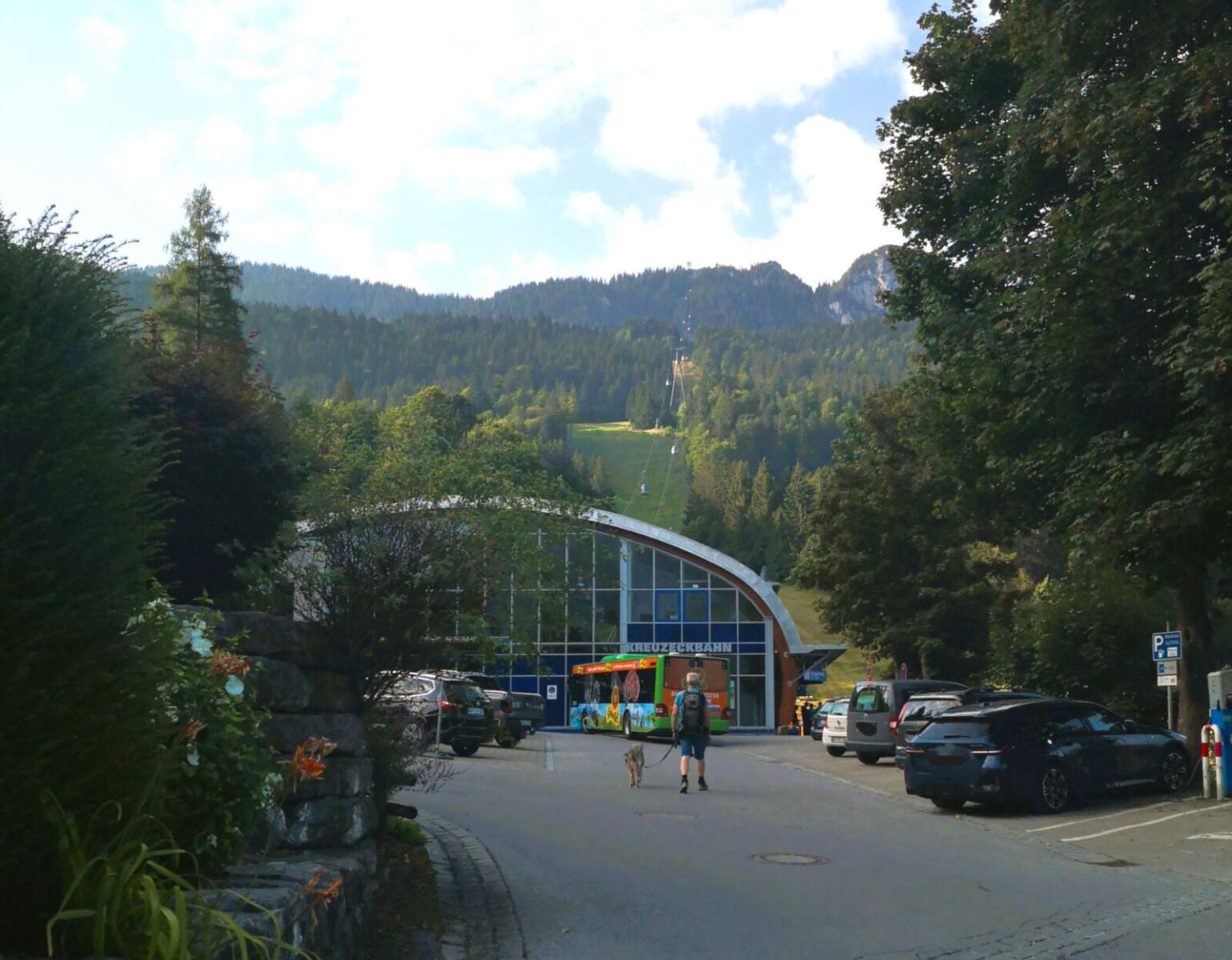 🗺️Ausgangspunkt unserer Wanderung ist die Talstation der Kreuzeckbahn in Garmisch-Partenkirchen. Von hier aus geht`s in einer geräumigen Gondel bergauf. Maulkorb ist nicht Pflicht. Aber weil man hier schon mal sehr dicht sitzen kann, haben wir ihn dabei.
