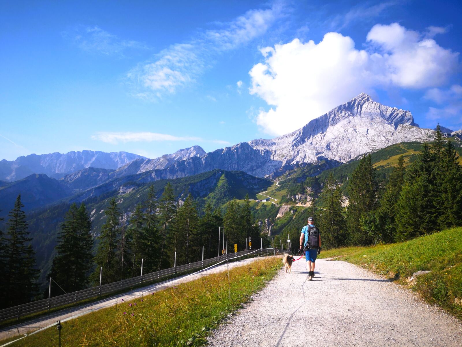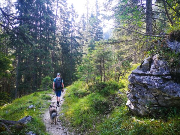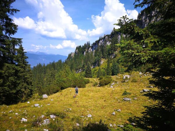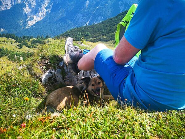 Warum es hier trotzdem so einsam ist? Vielleicht weil der Stuibn (1.924 m) prominente Konkurrenz hat. Der markante Bergrücken mit seinen zwei Gipfeln, der zu den nördlichen Kalkalpen gehört, liegt zwischen der berühmten Alpspitze und dem ebenso bekannten Schachen. Vom Stuibn lässt sich dem Könighaus am Schachen aufs Dach schauen. Und die Partnachklamm ist auch nicht weit. Die Klamm eignet sich nicht für jeden Hund und ist den Sommerferien oft knallvoll. Die Klammumgehung zum Schachen ist lang und etwas fade. Und ins Königshaus darf der Hund ohnehin nicht. Doch die Tour auf den Stuibn ist für Hundeleute viel mehr als ein Trostpflaster. Für uns ein echter Hauptgewinn.