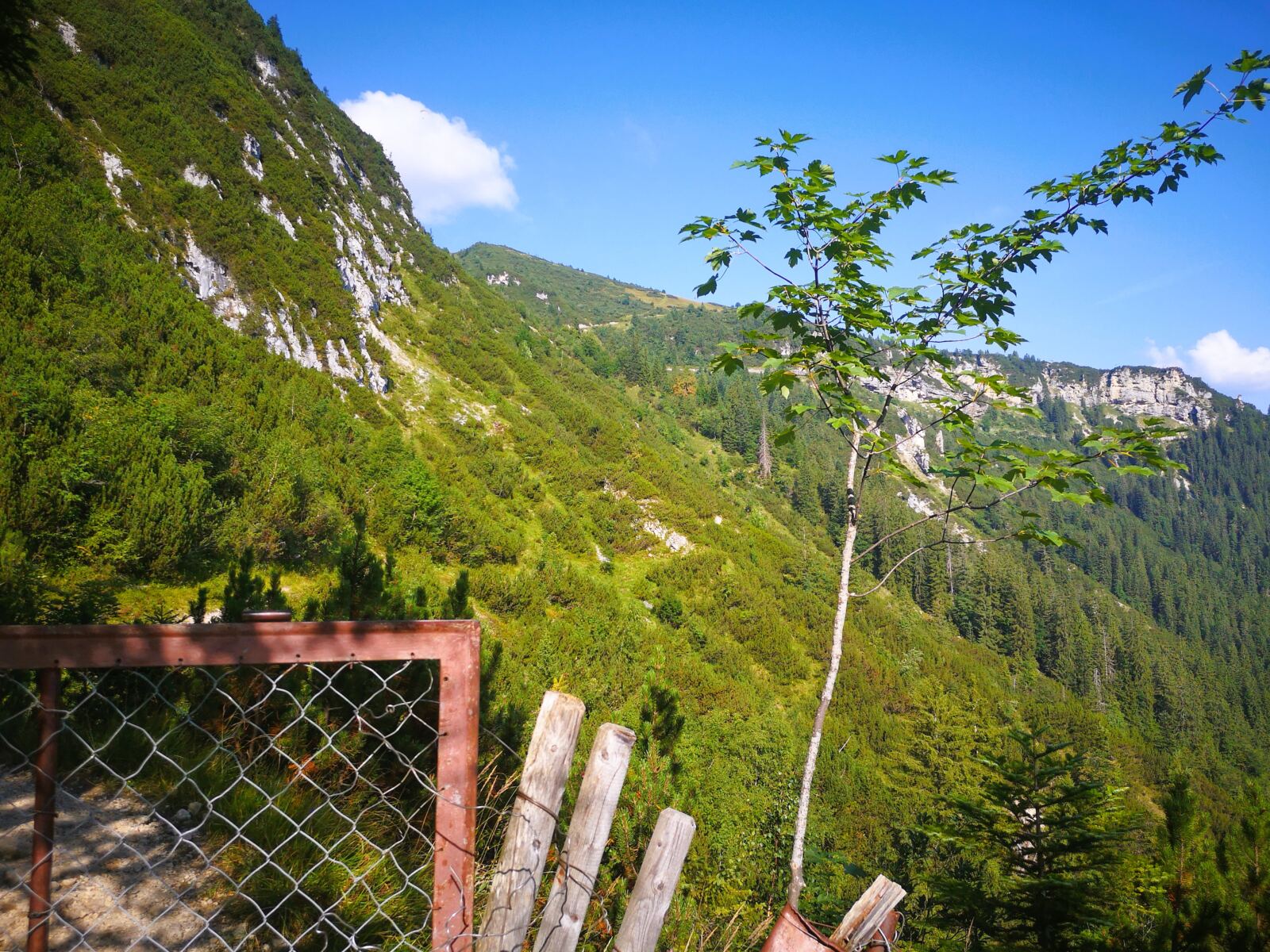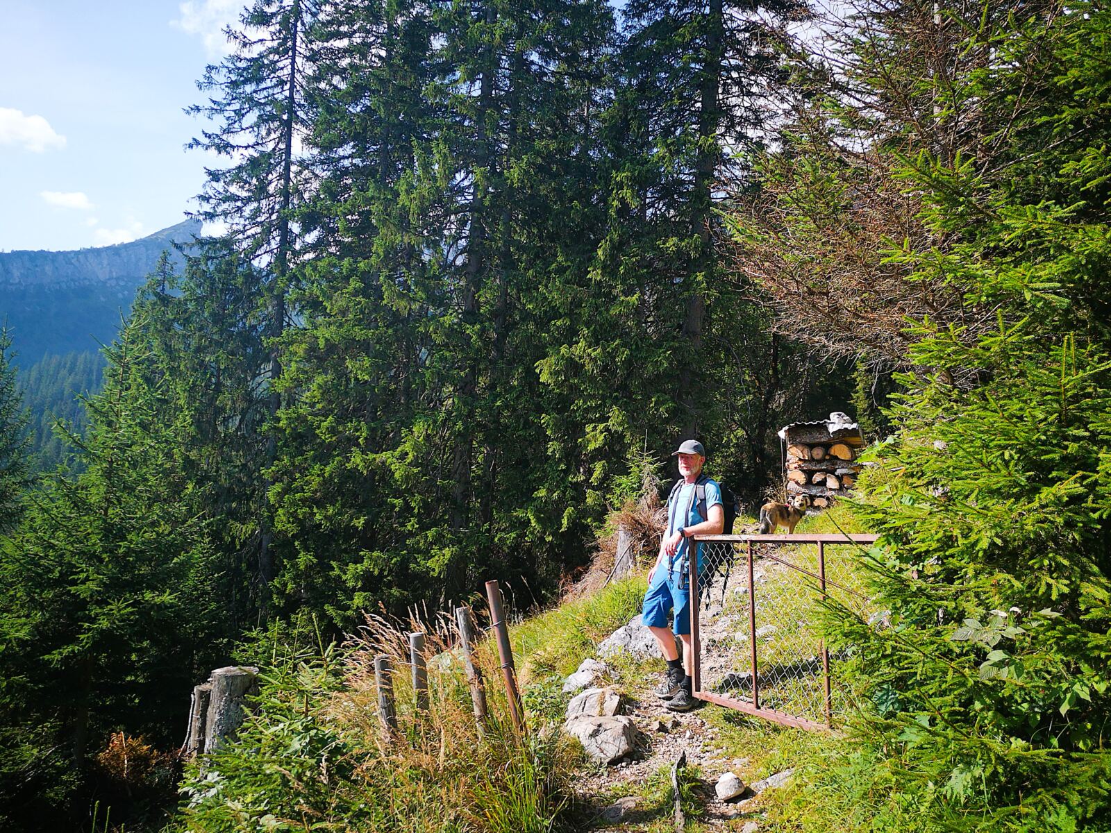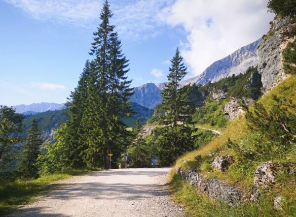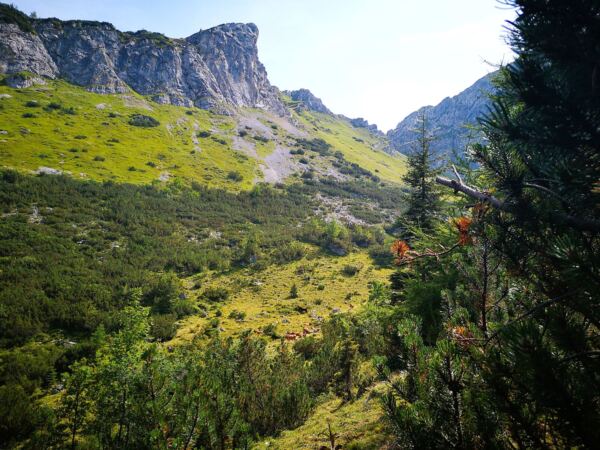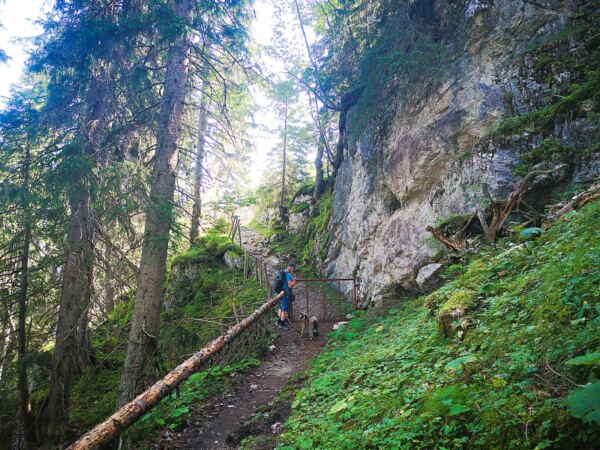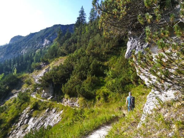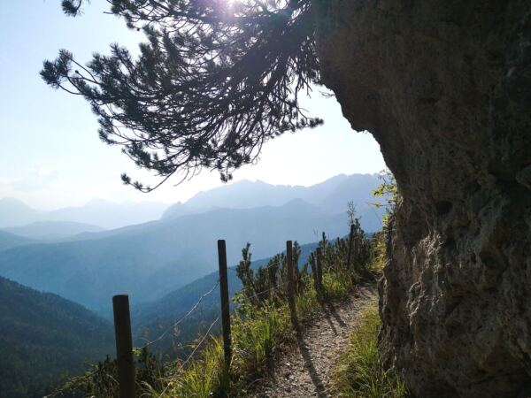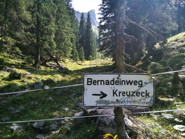 Wir folge dem schmalen, aber gut begehbaren Weg mit wunderschönem Blick auf die Bergkette und ins Reintal. Wo das Gelände links von uns abbricht, sichern uns Geländer. Auch Menschen, die nicht schwindelfrei sind, können den Steig genießen. Wir erreichen schließlich die nicht bewirtschaftete Bernadeinhütte. Hinter einem Viehgatter führt uns der Weg in einen schönen Wald hinein. Wir queren wenig später den Bernadeinlift, passieren die steil aufragenden Bernadeinwände und gelangen wenig später an eine Wegkreuzung. Wir folgen weiter dem Hauptweg geradeaus zunächst noch Richtung Bockhütte. Auch die zweite rechte Abzweigung ignorieren wir, bleiben weiter geradeaus dem Hauptweg.