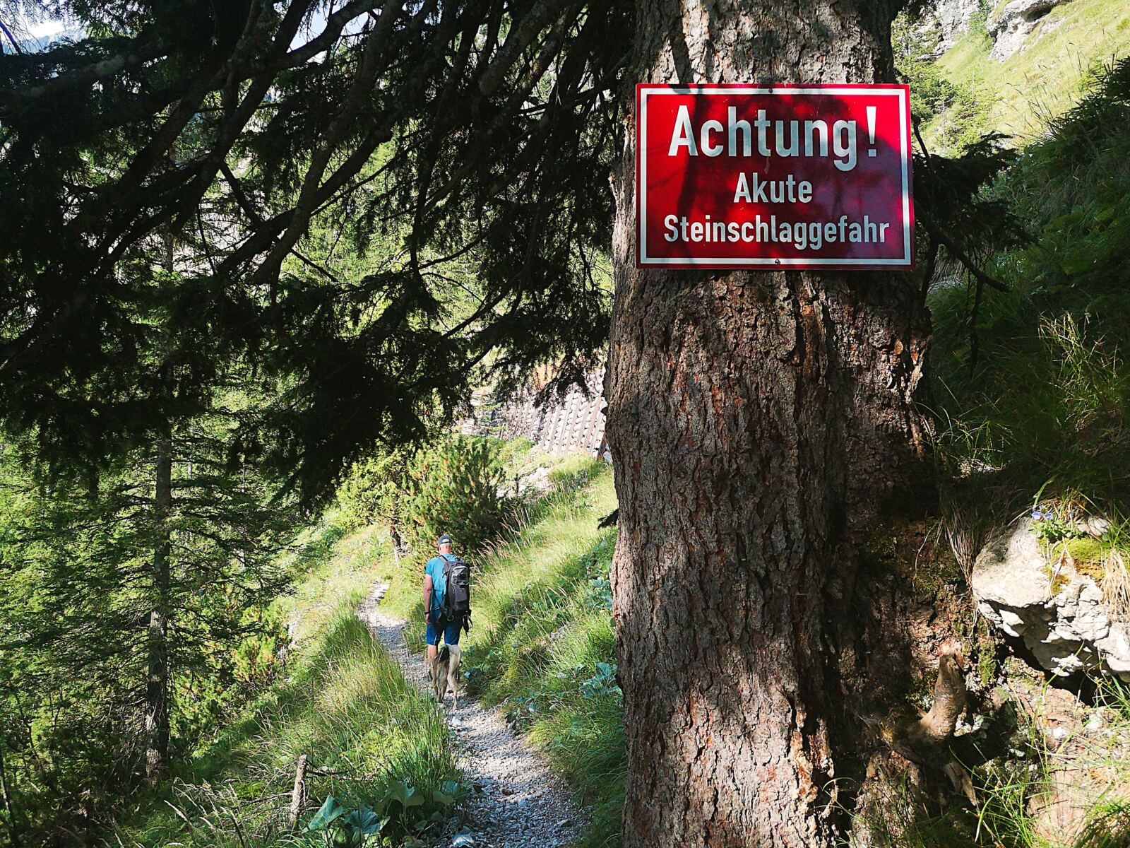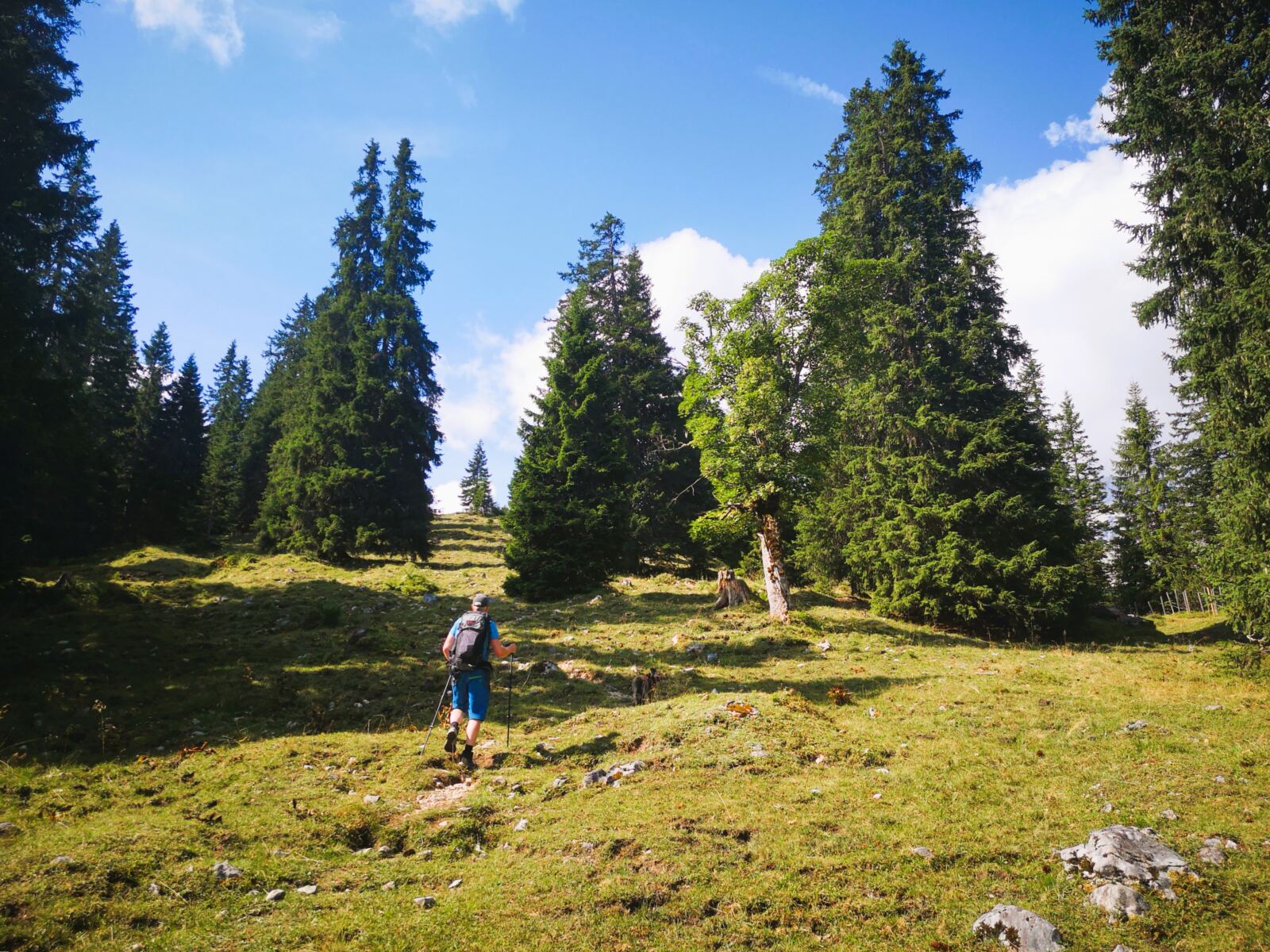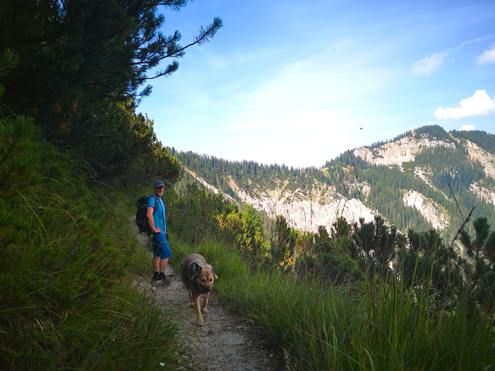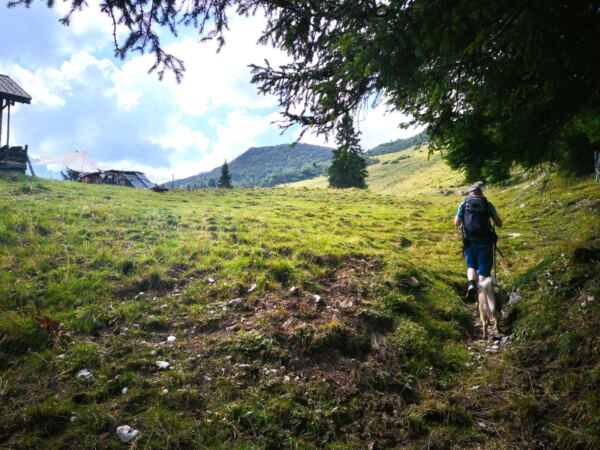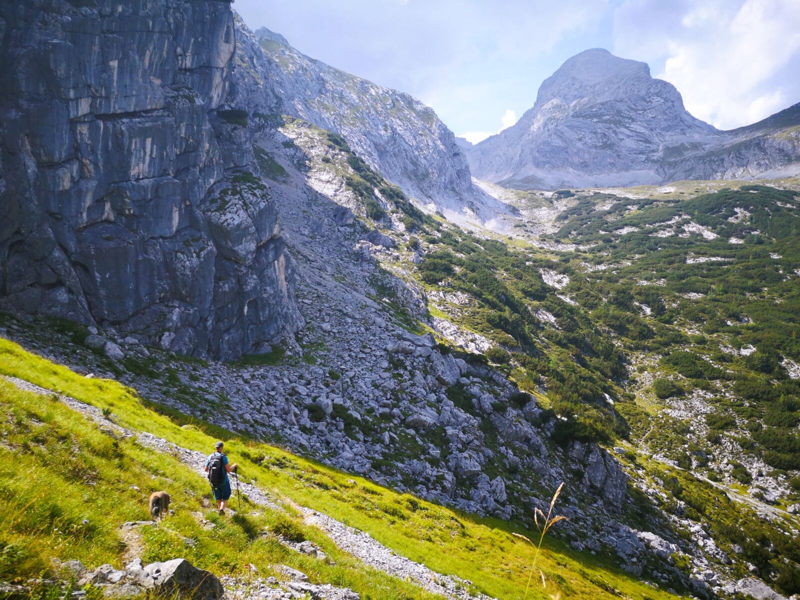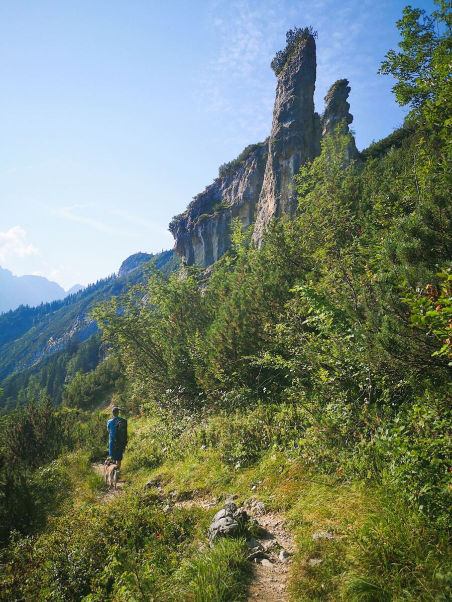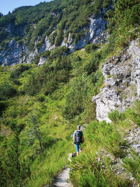 Weiter geht’s. Über kaum erkennbare Steigspuren wandern wir Richtung Stuibnkopf, dem zweiten, etwas höheren Gipfel des Stuibn. Auf den kurzen Abstieg folgt ein kurzer Gegenanstieg. Dann umrunden wir den Stuibnkopf über einen offenen Grashang. Den kurzen Ausflug auf den zweiten Gipfel sparen wir uns – einfach zu warm für Amos. Wenig später treffen wir auf den Schützensteig. Auf steinig-felsigem Pfad, der von Amos manchen Sprung verlangt, wandern wir recht steil unter den Stuibngipfeln bergab. Hier und da plätschern Rinnsale über den Pfad und machen ihn sehr rutschig.